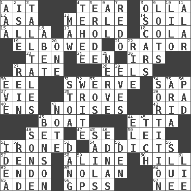 ACROSS 1. Small island 4. Lacerate 8. Spanish pot 12. White ___ sheet 13. Haggard of country music 14. Earth 15. Silent film actress Nazimova 17. Hold, grip (Informal) 18. Root beer relative 19. Turned at an angle; bent 21. Speaker 23. "___ Little Indians" 24. Car or cant ending 26. Big collection agency 27. Assign a rank or rating to 28. Snakelike fish 30. Snakelike fish 31. Turn aside suddenly 34. Plant excrement 37. Compete 38. Collection of objects 39. Mouth or opening 40. Followers of ems 41. Annoying sounds 42. To free from 43. Water vessel 44. Singer James 46. Arrange properly for use 47. Compass dir. 50. Luau accessory 51. Pressed 54. Inveterate users 57. Lairs 58. Place in a line 60. Land elevation 62. Inside; within (prefix) 63. Pitcher Ryan 64. Fr. "Yes" 65. An important port of Yemen 66. Global Positioning Systems (abbr.) 67. Born DOWN 1. American Automobile Association (abbr.) 2. Small island 3. Baron Munchausen's specialties 4. Giggle 5. Eat (away) 6. Everything 7. Make new 8. Motion picture awards 9. Plunders 10. _ and Stitch 11. Having or resembling wings 13. Informal term for the mouth 16. Collude with 20. Single 22. Cause heat under the collar 25. Boldness 27. It's straight from the horse's mouth 29. Nights before holidays 30. Night before a holiday 31. Portico 32. Compose 33. Greek goddess of the dawn 34. Making a chance decision by using lots 35. Roberta Peters solo 36. Writing tablet 41. Make mention of 43. Gillaume's butler role 44. Biblical high priest 45. Technical 46. Something which is sent 48. Moves on water 49. Ferber et al. 51. It may be bright or harebrained 52. Tear apart 53. Mild oath, euphamism for damn 55. Lair 56. Turn sharply 59. Chop off 61. Untruth