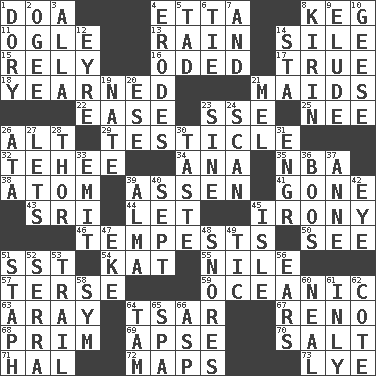ACROSS 1. ___ good deed 4. Singer James 8. Cask 11. Stare at amorously 13. Water falling in drops from the sky 14. Drop; flow; fall 15. Depend 16. Wrote a lyric poem 17. Loyal 18. Felt deep pity or tenderness 21. Unmarried girls 22. Comfort 23. Compass dir. 25. Born 26. The first octave above the treble staff 29. One of the two male reproductive glands 32. Giggle 34. Santa ___, CA 35. Basketball assoc. 38. Tiny particle 39. NE Netherlands city 41. Went 43. _ Lanka 44. Allow 45. Literary sarcasm 46. Storms 50. Observe 51. Fast jet (abbr.) 54. Krazy ___ of comics 55. "Death on the ____" 57. Laconic 59. Pertaining to the sea 63. Like ___ of sunshine 64. Russian ruler of old 67. Western Nevada city 68. Demure 69. Domed church section 70. Table seasoning 71. Actor Linden 72. Atlas contents 73. Potassium hydroxide DOWN 1. Small, narrow, flatbottom fishing boat 2. Double curve, resembling the letter S 3. Silent film actress Nazimova 4. Eats (away) 5. Bit 6. Make a knot 7. Also 8. Japanese brewing company 9. Evade 10. Honkers 12. Jane of fiction 14. R.R. building 19. Nathan's nickname 20. Compass dir. 21. Cartoonist voice _ Blanc 23. Trig term 24. Skim 26. "One Day ___ Time" 27. Allows 28. Son of Odin 30. Clothes sense 31. Engineer (abbr.) 33. Send forth 36. Expressions of contempt or scorn 37. Singer Murray 39. _ mater 40. Back-to-school mo. 42. Sight organ 45. Small island 47. Make supply last 48. Sounds asleep 49. Nervous spasm 51. Staphylococcus 52. Father Junipero _ 53. Drop behind 56. Hearing organs 58. Symbol (abbr.) 60. Anneal 61. In an inward manner 62. ____ d'Azur (French Riviera) 64. Scottish cap 65. Health resort 66. Cleo's killer