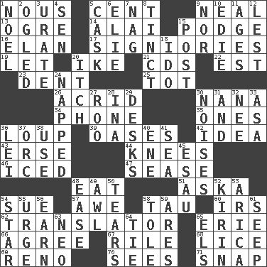 ACROSS 1. Horse sense 5. Penny 9. Be tempered by heat 13. Legendary monster 14. Jai _ 15. Puddle 16. Style 17. Seigniories (variant) 19. Allow 20. Mamie's mate 21. Music discs 22. Eastern Standard Time (abbr.) 23. Gouge 25. Small child 26. Bitter 30. Nanny 34. Give a jingle 35. Washington bills 36. Central Nebraska county 39. Fertile tracts in a desert 42. The content of cognition 43. Celtic language 44. Leg joints 46. On the rocks 47. Gospel singer Marvin 48. Erode 51. "____ silly question..." 54. Institute legal proceedings 57. Deep reverence 58. The 19th letter of the Greek alphabet 60. Big collection agency 62. Interpreter 65. One of the Great Lakes 66. Match 67. Cause heat under the collar 68. Louse (plural) 69. Former U.S. Attorney General Janet 70. Observes 71. Fastener DOWN 1. Christmas carol 2. Stared 3. A salt of uric acid 4. Elected rep. 5. Keg 6. Writer Wiesel 7. Tired old horse 8. Colored lightly or faintly 9. Not either 10. Singer Brickell 11. Ripens 12. For fear that 15. Mail 18. Wedding promise 20. Hankering 24. Slept 27. Friend of Pooh 28. _ tizzy (2 wds.) 29. Writing tables 30. Annoying sounds 31. Added to 32. Born 33. White ___ sheet 36. Luau accessory 37. The grampus (Milton) 38. Purpose 40. Compass dir. 41. Ocean 45. Son of Isaac 48. Relaxation 49. Leather borer 50. Rends 52. Japanese brewing company 53. N. Chile seaport 54. Play the lead 55. Goad 56. Merit 58. Lacquered or enameled metalware 59. Ancient Greek god of war 61. Ooze 63. Modern: prefix 64. Make a knot 65. Raised railways