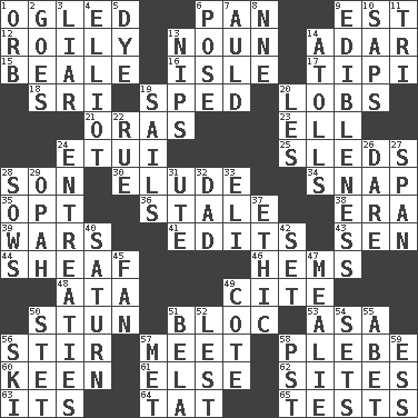ACROSS 1. Stared at amorously 6. Baking dish 9. Eastern Standard Time (abbr.) 12. Agitated, as a liquid 13. Part of speech 14. The sixth month of the Jewish calendar 15. Calif. Air Force Base 16. Capri or Wight 17. Native american tent (variation) 18. Indian title of respect (Mr.) 19. Broke a traffic law 20. Tennis shots 21. Mouths or openings 23. Pipe bend 24. Needle holder 25. Bobsleighs 28. Boy, to dad 30. Dodge 34. Fastener 35. Choose 36. Lacking originality or spontaneity 38. Epoch 39. Armed conflicts 41. Proofreads 43. Elected rep. 44. To gather and bind into a bundle 46. Folds over and sews together 48. "One Day ___ Time" 49. Quote 50. Surprise greatly 51. Alliance 53. White ___ sheet 56. Commotion 57. Rendezvous 58. First-year military academy student 60. Peachy ____! 61. Otherwise 62. Settings 63. ___ a Wonderful Life 64. Make lace 65. Trials DOWN 1. Globe 2. Moves 3. One who doesn't tell the truth 4. American author Paul (1891-1958) 5. Color 6. Airs 7. Old (Scot.) 8. Compass dir. 9. The property of being fit to eat 10. Plant excrements 11. Three (prefix) 13. Pinches, bites 14. Ringlike coral islands and reefs 19. Moves on water 20. French article 22. Sorrow 24. Pleas 26. Have the gumption 27. Connect, as a bridge 28. Sty mamas 29. Brightly colored fish 31. Shoshoni 32. June honoree 33. Connecticut Ivy Leaguer 37. Moral principle 40. Titan orbits this 42. Arrange properly for use 45. Avid follower 47. Ear of corn 49. ____ d'Azur (French Riviera) 50. Proofreading order 51. Actor Lugosi 52. For fear that 54. Puts into a specified state 55. Collude with 56. What Jean-Claude Killy likes to do 57. Was introduced to 58. Pacific Standard Time (abbr.) 59. Double-curved letter