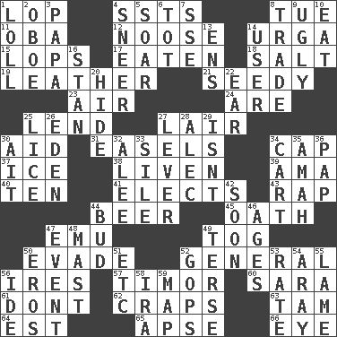 ACROSS 1. Trim (branches) 4. Fast planes 8. Third day of the wk. 11. Chief or king in Benin or Nigeria 12. Trap for birds or small mammals 14. Capital and largest city of Mongolia 15. Chops off 17. Eroded 18. Table seasoning 19. Cordwainer's material 21. Shabby and untidy 23. Atmosphere 24. "We ___ not amused" (Victoria) 25. Grant temporary use of 27. Den 30. Assist 31. Artist's stands 34. Head covering 37. Frozen water 38. Make or become more lively 39. Housemaid (var.) 40. Nine, plus one 41. Opts 43. Hit sharply and swiftly 44. Fermented drink made from hops 45. Pledge 47. Australian flightless bird 49. Coat; cloak 50. Elude 52. Commissioned military rank 56. Angers 57. The easternmost of the Lesser Sundas 60. "Two Mules for Sister ____" 61. Do not 62. Dice game 63. Scottish cap 64. Eastern Standard Time (abbr.) 65. Domed church section 66. Sight organ DOWN 1. Hang loosely or laxly 2. Mitch Miller's instrument 3. Dad 4. Scornful expression 5. Fly high 6. Small child 7. Compass dir. 8. Exchange 9. Repulsive 10. Ingest 13. Followers of ems 14. One who makes use of a thing 16. Comedian Laurel of Laurel & Hardy 20. Flintstone garb 22. Hearing organ 25. Louse (plural) 26. Locale of original sin 27. Crowbar 28. Actor Baldwin 29. Is not 30. Small island 32. Toward shelter 33. Filth; sediment 34. Haul 35. Wet nurse 36. Infant food 42. Within a short period 44. Partially opened flower 46. Matures 47. Happening 48. Vertical spar for supporting sails 49. Laconic 50. Greek god of love 51. And so on (abbr.) 52. Republicans 53. Pace 54. Like ___ of sunshine 55. Unable to walk 56. Binary compound 58. Lyricist Gershwin 59. Atlas unit