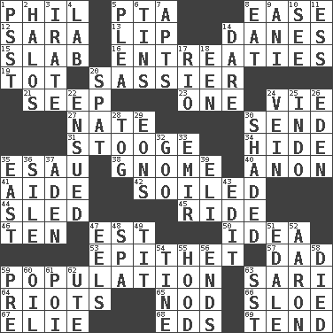 ACROSS 1. Silvers or Donahue 5. Parent Teacher Association (abbr.) 8. Relaxation 12. "Two Mules for Sister ____" 13. Mouth edge 14. Natives or inhabitants of Denmark 15. Broad, flat, thick piece 16. Pleas 19. Small child 20. More lively and spirited 21. Ooze 23. Single 24. Compete 27. Nathan's nickname 30. Transmit 31. Moe Howard, for one 34. Flintstone garb 35. Son of Isaac 38. Dwarf 40. At once, immediately (arch.) 41. Assistant 42. Dirtied 44. Downhill vehicle 45. Travel on an animal 46. Nine, plus one 47. Eastern Standard Time (abbr.) 50. The content of cognition 53. Curse 57. June honoree 59. Census information 63. Indian skirt 64. Debaucheries 65. Lower and raise head in agreement 66. _ gin 67. Writer Wiesel 68. Begley and Asner 69. Be inclined (to) DOWN 1. Inconspicuous attention getter 2. Saint headwear 3. Feeling or showing extreme anger 4. Experiment locale 5. Entreaty 6. Airtight sealed metal containers 7. Flats, for short 8. Erode 9. Cuckoo 10. Observe 11. Double-curved letter 14. Have the gumption 17. _ de Janeiro 18. Car or cant ending 20. Argument over a trivial matter 22. Took place subsequently 24. Distinctive style or manner 25. _ china 26. Genesis locale 28. Coat; cloak 29. Immeasurably long periods of time 30. Cast a shadow over 32. Thick or sticky substance 33. Arab leader 35. Compass direction 36. Filth; sediment 37. Arabian gulf 39. Connecticut Ivy Leaguer 43. Prepare for publication 47. Snakelike fish 48. Health resort 49. Teat (slang) 51. Peak District village in England 52. Composer Copland 54. Prong on a fork 55. Parka part 56. Extremities 58. Passed on 59. Before (prefix) 60. Lubricate 61. Luau course 62. Shoshoni 63. Fast jet (abbr.)