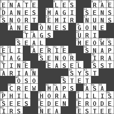 ACROSS 1. Maternal 6. French article 9. Actress Charlotte 12. Natives or inhabitants of Denmark 13. Wise men 14. Elected reps. 15. Derisive sound 16. Independent ruler or chieftain 17. Religious women 18. A saturated hydrocarbon 19. Singles 20. Went 21. Labels 23. RI univ. 24. Lick closed 25. Catcalls? 28. Biblical high priest 30. Nest on high 34. Fastener 35. Label 36. Sir (Sp.) 38. Retirement account (abbr.) 39. Prong on a fork 41. Artist's stand 43. Fast jet (abbr.) 44. Believer in; advocate of (suffix) 46. System (abbr.) 48. Bear (Spanish) 49. Proofreading order 50. Ship's personnel 51. Atlas contents 53. White ___ sheet 56. Silvers or Donahue 57. Israeli folk dance 58. Ms. Damita and namesakes 60. Perceives with the eye 61. Locale of original sin 62. Eat (away) 63. Big collection agency 64. Teachers' org. 65. First name in cosmetics DOWN 1. Begley and Asner 2. Grandmother 3. Soon (poet.) 4. Cigar-shaped 5. Eastern Standard Time (abbr.) 6. Unable to walk 7. The front part of a cuirass 8. Title for a knight 9. One who advocates reunion 10. Queen of England 1702-14 11. Curvy letter 13. Not women's 14. Sounds asleep 19. Stares 20. Chewing product 22. American Automobile Association (abbr.) 24. Seigniories (variant) 26. Armed conflicts 27. Petty quarrel 28. Singer James 29. Den 31. To sift 32. _ tizzy (2 wds.) 33. Greek goddess of the dawn 37. Musical pauses 40. Artist's stands 42. Sodium hydroxide 45. At this time 47. Flight of steps 49. Connect, as a bridge 50. "Mermaids" star 51. Method 52. Length times width 54. Position in a hierarchy or organization 55. Helper 56. Air pressure measure (abbr.) 57. Layer 58. Area sheltered from the wind 59. Observe