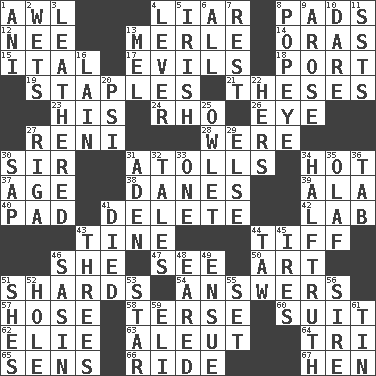 ACROSS 1. Leather borer 4. One who doesn't tell the truth 8. Groovy apts. 12. Born 13. Haggard of country music 14. Mouths or openings 15. Slanted text style (abbr.) 17. Vices 18. Left side of a ship or aircraft 19. Paper fasteners 21. College papers 23. Part of HMS, perhaps 24. 17th letter of the Greek alphabet 26. Sight organ 27. Painter Guido (1575-1642) 28. We are 30. Title for a knight 31. Ringlike coral islands and reefs 34. Being at a high temperature 37. Ripen 38. Natives or inhabitants of Denmark 39. In the manner of 40. Writing tablet 41. Erase 42. Experiment locale 43. Prong on a fork 44. Small quarrel 46. A female animal or person 47. Observe 50. Tate display 51. Pottery fragments 54. Statements in reply to questions 57. Flexible conduit 58. Laconic 60. Set or collection 62. Writer Wiesel 63. Eskimo relative 64. Three (prefix) 65. Elected reps. 66. Travel on or in a vehicle 67. Layer DOWN 1. Cuckoo 2. Moistens 3. Resembling or made to resemble leather 4. Prying instrument 5. From or relating to Ireland 6. 100% 7. Respite 8. Wimpy's pal 9. Came up 10. Have the gumption 11. Fast planes 13. Cartoonist voice _ Blanc 16. (Had) reclined 20. Air pressure measure (abbr.) 22. Possessive pronoun 25. A small or young owl 27. Capital of Latvia 29. Otherwise 30. Plant excrement 31. An important port of Yemen 32. Falsehoods 33. Single 34. Not exactly gospel 35. Norwegian king 36. Bar bill 41. Passed on 43. Triads 44. The 23rd letter of the Hebrew alphabet 45. Angers 46. Indian antelope 48. Having ears or earlike features 49. Take place subsequently 51. "______ My Girl" (Turtles hit) 52. Hollow 53. Play the lead 55. Put into a specified state 56. Title for a man of rank and authority 59. Biblical high priest 61. Shallow baking pan