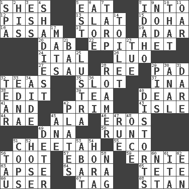ACROSS 1. "______ My Girl" (Turtles hit) 5. Ingest 8. To the inside or interior of 12. Expression of disdain 13. Narrow board 15. Capital of the state of Qatar 16. Indian state 18. "Corrida" creature 19. The sixth month of the Jewish calendar 20. Apply (a substance) by light strokes 22. Curse 24. Slanted text style (abbr.) 26. Nilotic language 27. He sold his birthright 28. To sift 29. Groovy apt. 32. Afternoon social gatherings 35. Notch 37. _ tizzy (2 wds.) 38. Prepare for publication 39. Afternoon social gathering 40. Letter starter 41. Also 42. Demure 43. Capri or Wight 44. Actress Charlotte 45. In the manner of 46. Greek god of love 49. Heredity factor (abbr.) 50. The smallest animal of a litter 51. Leopard's kin 55. Environmental prefix 56. A blast of a horn 57. Inky black, to poets 59. Bert's buddy 63. Domed church section 64. "Two Mules for Sister ____" 65. Wig 66. One who uses or employs something 67. Label 68. Comedian Laurel of Laurel & Hardy DOWN 1. Health resort 2. Part of HMS, perhaps 3. Double-curved letter 4. Most questionable 5. Eastern Standard Time (abbr.) 6. Medicinal plant 7. Canvas cover 8. Potato state 9. Thickened enlargement 10. Not this but _ 11. Boat paddle 14. Bathroom 17. Floor coverings 21. Sound made by sheep 23. Third day of the wk. 25. A period of five years 28. Nomad 29. Sliced desserts 30. Of or related to the anus 31. Have the gumption 32. Separate forcefully 33. Pulitzer Prize-winning author Ferber 34. Helper 36. Luau accessory 40. What propaganda does 42. Food holders 45. A saturated hydrocarbon 47. Sorrow 48. At one time in the past 49. Prevent from occurring 51. 911 reaches them 52. Stockings 53. Blind as ____ 54. Israeli folk dance 56. The 19th letter of the Greek alphabet 58. Tired old horse 60. Fish or hair follower 61. Call ___ day 62. Car or cant ending