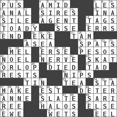 ACROSS 1. Product of festering 4. Among 8. French article 11. Of or related to the anus 13. Fathers 15. _ tizzy (2 wds.) 16. Drop; flow; fall 17. Rep 18. Labels 19. Sycophant 21. Compass dir. 22. Blunders 23. Conclude 24. Make supply last 27. Scottish cap 29. Toward the sea 30. Arguments over trivial matters 34. Cartoonist voice _ Blanc 36. Celtic language 39. Mexican monetary units 40. Christmas carol 41. Boldness 43. Three-handed card game 44. Lowest deck of a ship 46. Passed on 47. Small boy 48. Musical pauses 49. Cuts off 51. Shallow baking pan 53. Beverage made from leaves 54. R.R. building 57. Create 60. Eastern Standard Time (abbr.) 63. Prevent from occurring 65. Queen of England 1702-14 66. Schedule 69. Indian skirt 70. To riddle 71. Saint headwear 72. Otherwise 73. She-sheep 74. Moistens 75. Snakelike fish DOWN 1. Thick mixture 2. The state of being joined or united 3. Vegetable dish 4. White ___ sheet 5. Russian fighter aircraft 6. Angers 7. Lairs 8. One who doesn't tell the truth 9. Engineer (abbr.) 10. Backtalk 12. Directed 14. Proofreading order 18. Storms 20. Affirmative reply 25. Peachy ____! 26. Having ears or earlike features 28. Cleo's killer 29. One to whom something is allotted 31. "____ silly question..." 32. Frog relative 33. Fast jet (abbr.) 34. Greater amount 35. Snakelike fish 37. Indian title of respect (Mr.) 38. Incident 40. And not 42. Singer Brickell 45. 23rd letter of the Greek alphabet 50. Writing tablet 52. Delicate 54. Showing deterioration from age 55. Laconic 56. Satellite of Uranus 57. Female horse 58. Afresh 59. Leg joint 61. Cole _ (cabbage dish) 62. Lie 64. Compass dir. 67. Small child 68. Curvy letter