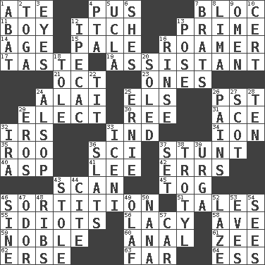 ACROSS 1. Had dinner 4. Fluid product of inflammation 7. Group of countries in special alliance 11. Male child 12. Hankering 13. First class 14. Ripen 15. Diluted with white 16. Nomad 17. Clothes sense 19. Aide 21. Sep. follower 23. Washington bills 24. Mountain range southwest of Kyrgyzstan 25. Raised railways 26. Pacific Standard Time (abbr.) 29. Opt 30. To separate or throw off 31. Adept person 32. Big collection agency 33. Indiana (abbr.) 34. Electrically charged atom 35. Friend of Pooh 36. _-fi 37. Difficult or unusual or dangerous feat 40. Cleo's killer 41. Area sheltered from the wind 42. Blunders 43. Glance over 45. Coat; cloak 46. Drawing lots 51. Lies 55. Foolish or stupid persons 56. Made of lace 58. "___ Maria" 59. Having high moral qualities 60. Of or related to the anus 61. Last letter of the English alphabet 62. Celtic language 63. At a great distance 64. Double-curved letter DOWN 1. Blind as ____ 2. Ancient Roman robe 3. Snake ____ (dice throw) 4. Parent Teacher Assoc. 5. Southern CA. univ. 6. "______ My Girl" (Turtles hit) 7. Naughty children 8. Pale green bean 9. Sign of something about to happen 10. Foregone conclusion 12. Medicinal drug used to evoke vomiting 13. Introduce or present, as a question 16. Remove soap 18. Lacquered or enameled metalware 20. Having a sole or soles 22. Teat (slang) 24. Columnist Joseph or Stewart 25. Bert's buddy 26. Aches 27. Highlander 28. Nine, plus one 29. Greek god of love 32. Retirement account (abbr.) 33. Ancient Celtic tribe of eastern Britain 36. Narrow boards 37. Put into a specified state 38. Trinitrotoluene 39. Capital and largest city of Mongolia 43. Took without asking 44. Quote 46. Trig term 47. Aroma 48. Chest bones 49. Norwegian king 50. Grandmother 52. Goldbrick 53. Nights before holidays 54. Perceives with the eye 57. Auto