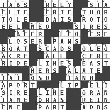 ACROSS 1. Bar bills 5. Have trust in 9. R.R. building 12. Writer Wiesel 13. 4th largest of the Great Lakes 14. Son of Odin 15. Lacquered or enameled metalware 16. Raised platform 17. Printing process, for short 18. Snakelike fish 19. Modern: prefix 21. Male parents of animals 22. Fermented drink made from hops 24. Lion 26. Compass dir. 27. Failure 28. Baking dishes 29. Water vessel 30. Heaps 32. Margarine 36. Land measure 37. 100% 38. Sure thing 39. Travel on an animal 40. Citrus fruits 42. Compass direction 43. Possessive pronoun 44. Having winglike extensions 46. Make lace 49. Bear (Spanish) 50. Hyperbolic tangent 51. To the left, to Queeg 53. Mouth edge 54. Biblical high priest 57. Beget 58. Citrus frut 61. Northwest Algerian city 62. Not wild 63. Mouths or openings 64. It's straight from the horse's mouth 65. Compass dir. 66. Component 67. Sums up DOWN 1. Wig 2. Medicinal plant 3. Big road sign 4. Perceive with the eye 5. Do over again 6. Epoch 7. Cards in a Roman deck? 8. Affirmative reply 9. Dinah or Pauly 10. Hauls 11. Came up 14. Three (prefix) 19. Born 20. Blunders 21. Distress signal 23. First name in cosmetics 24. Dipping utensil 25. Followers of ems 27. Venues 28. Insides of hands 29. Tavern 31. Capital of Egypt 32. Sea 33. Resembling or made to resemble leather 34. Celtic language 35. Baseball player Mel 40. French article 41. Suttee (variant) 43. Being at a high temperature 45. Infant locale 46. Clothes sense 47. Bee-related 48. Singer Mel 52. To riddle 53. For fear that 55. Put down 56. Restaurants 58. Trim (branches) 59. Lyricist Gershwin 60. Third mo. 61. Mouth or opening