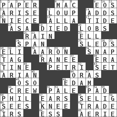 ACROSS 1. Some stationery 6. Apple computer (short form) 9. Greek goddess of the dawn 12. Get up 13. Central Nebraska county 14. Does sums 15. Sibling's daughter 16. Silent film actress Nazimova 17. Event that recurs at intervals 18. White ___ sheet 19. Passed on 20. Tennis shots 21. Precipitation 23. Pipe bend 24. Connect, as a bridge 25. Bobsleighs 28. Connecticut Ivy Leaguer 30. Composer Copland 34. Fastener 35. Label 36. The wife of a rajah (variant) 38. Period 39. Prong on a fork 41. _ dish (used to culture cells) 43. Put into a specified state 44. Believer in; advocate of (suffix) 46. Mouths or openings 48. Bear (Spanish) 49. Dutch treat 50. Group working together 51. Light colored 53. Writing tablet 56. Silvers or Donahue 57. Hearing organs 58. Former Milwaukee Brewers owner Bud 60. Perceives with the eye 61. Leg joint 62. Barter 63. Big collection agency 64. Double-curved letter 65. Nest on high DOWN 1. Baking dish 2. Roberta Peters solo 3. Sliced desserts 4. Fortification 5. Portuguese money of account (variant) 6. Undercover agent 7. Old (Scot.) 8. Tax preparer (abbr.) 9. The property of being fit to eat 10. Likelihood 11. Compass dir. 13. (Had) reclined 14. Ringlike coral islands and reefs 19. Middle Eastern gold or silver currency 20. French article 22. Auto club (abbr.) 24. Seigniories (variant) 26. Have the gumption 27. Argument over a trivial matter 28. Singer James 29. Den 31. Hit sharply and swiftly 32. Single 33. Remaining after all deductions 37. Wear away 40. Artist's stands 42. Lyricist Gershwin 45. Immediately 47. Electrical Unit 49. Otherwise 50. "Mermaids" star 51. Baking dishes 52. Ancient Greek god of war 54. Having or resembling wings 55. "You Light Up My Life" star Conn 56. Air pressure measure (abbr.) 57. Supplement with great effort 58. R.R. building 59. Turn to the right
