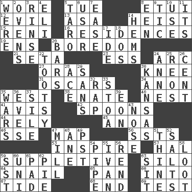 ACROSS 1. Had on 5. Third day of the wk. 8. Needle holder 12. Tending to cause great harm 13. White ___ sheet 14. Robbery 15. Painter Guido (1575-1642) 16. Dwellings 19. Followers of ems 20. Mood resulting from idleness 21. Stalk of a moss capsule 23. Double-curved letter 24. Curve 27. Mouths or openings 30. Leg joint 31. Motion picture awards 34. Soon (poet.) 35. 270 degrees 38. Maternal 40. A home for chicks 41. Deliberation 42. Soup utensils 44. Have trust in 45. Small Philippine buffalo 46. Compass dir. 47. Atlas unit 50. Fast planes 53. Heighten or intensify 57. Actor Linden 59. Supplying deficiencies 63. Grain storage tower 64. Slow-paced one 65. Baking dish 66. To the inside or interior of 67. Periodic rise and fall of the sea level 68. Conclude 69. Trial DOWN 1. We are 2. Baking chambers 3. Remove soap 4. Biblical high priest 5. Edible starchy tuberous root 6. One who makes use of a thing 7. Comfort 8. Car or cant ending 9. Nervous spasm 10. Purpose 11. ___ a Wonderful Life 14. Folds over and sews together 17. Binary compound 18. Two (Sp.) 20. Soap units 22. Tootsie (variant) 24. Singer Murray 25. Vintage cars 26. Penny 28. Adept person 29. Without 30. Sunflower state 32. Strike 33. Portico 35. Armed conflicts 36. Nights before holidays 37. Drop; flow; fall 39. A really long time 43. Characteristic smell of wine 47. Place where flour is made 48. A saturated hydrocarbon 49. Pacific Standard Time (abbr.) 51. One or ones belonging to thee 52. Table seasonings 54. Corncob 55. "Terrible" tsar 56. Tear apart 58. Spoils 59. Fast jet (abbr.) 60. Corn or form start 61. Groovy apt. 62. Sliced dessert 63. Be seated