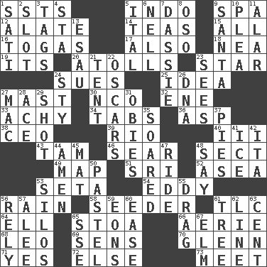 ACROSS 1. Fast planes 5. Southeast Asian peninsula 9. Health resort 12. Having winglike extensions 14. Afternoon social gatherings 15. 100% 16. Ancient Roman robes 17. In addition 18. Teachers' org. 19. ___ a Wonderful Life 20. Ringlike coral islands and reefs 23. Play the lead 24. Takes to court 25. It may be bright or harebrained 27. Vertical spar for supporting sails 30. Non-commissioned officer (abbr.) 32. Compass dir. 33. Painful 34. Bar bills 36. Viper 38. Corporate head (abbr.) 39. River (Sp.) 40. One more than two 43. Scottish cap 46. Burn superficially 48. Religious group 49. Atlas unit 51. _ Lanka 52. At sea 53. Stalk of a moss capsule 54. Whirlpool 56. Water falling in drops from the sky 58. Sowing specialist 61. Affectionate concern, for short 64. Pipe bend 65. Portico 66. Nest on high 68. Lion 69. Elected reps. 70. American astronaut and politician John 71. Consenting reply 72. Otherwise 73. Rendezvous DOWN 1. Suttee (variant) 2. Notch 3. Labels 4. R.R. building 5. Slanted text style (abbr.) 6. 1994 drama film starring Jodie Foster 7. Small ungulate mammals of Africa 8. Bear (Spanish) 9. Before Barbara or Clara 10. Entreaty 11. Having or resembling wings 13. Son of Isaac 21. Portable shelter 22. Motion picture awards 23. Observes 24. Filthy place 26. Heredity factor (abbr.) 27. Apple computer (short form) 28. Adept person 29. Went for two points 31. Off-Broadway awards 35. Flew 37. Sliced desserts 41. Frozen water 42. Call ___ day 44. So be it 45. Floor protector 47. Travel on or in a vehicle 48. Declare 50. Soft color 53. Grain storage towers 55. To be drawn or hauled along 56. Have confidence or faith in 57. Toward shelter 59. Immeasurably long periods of time 60. Comfort 61. Relationship diagram 62. Actor's bit 63. Penny 65. Compass dir. 67. Shade tree