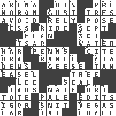ACROSS 1. Sports stadium 6. Part of HMS, perhaps 9. Before (prefix) 12. Person of subnormal intelligence 13. Abrupt rush of wind 14. Angers 15. Keep away from 16. Depend 17. Airs 18. Curvy letter 19. Travel on an animal 20. Back-to-school mo. 21. Flair 23. _-fi 24. Russian ruler of old 25. Wetness 28. Make imperfect 30. Actor Sean's family 34. Quote 35. Mouth or opening 36. Indian princess (variant) 38. _ moment's notice (2 wds.) 39. Hiding places for outlaws 41. Honkers 43. Scottish cap 44. Artist's stand 46. Family _ (genealogy) 48. Area sheltered from the wind 49. Lick closed 50. Small boys 51. Nathan's nickname 53. RI univ. 56. Haul 57. Light colored 58. Proofreads 60. Russian composer Stravinsky 61. In a ____ (agitated or irritated) 62. Viva Las _ 63. Hearing organ 64. Make lace 65. Peak District village in England DOWN 1. Nursemaid (var.) 2. Be footloose 3. Greek god of love 4. Annoying sounds 5. Also 6. Became colored 7. Small island 8. Filthy place 9. Appease 10. Respite 11. Compass dir. 13. Smile widely 14. Medicinal drug used to evoke vomiting 19. Less widely known 20. Compass dir. 22. Pet locale 24. Interpreter 26. Singer James 27. 480, 500 or 516 sheets of paper 28. Method 29. Type of rug 31. Tired old horse 32. Compass dir. 33. Observe 37. First name in cosmetics 40. Sowing specialist 42. Period 45. French article 47. Evaded 49. Proofreading order 50. Ancient Roman robe 51. Nanny 52. Set down 54. Port city in Latvia 55. Slanted text style (abbr.) 56. Standoff 57. Pacific Standard Time (abbr.) 58. First lady 59. Compass dir.