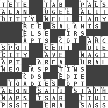 ACROSS 1. Wig 5. Bar bill 8. Friends 12. Actor Alda or Thicke 13. Double curve, resembling the letter S 15. Came down and settled, as after flight 16. Simple song 18. Water source 19. Kenny Rogers chart-topper in '80 20. Portuguese money of account (variant) 22. Deli grouping 24. Otherwise 26. Big collection agency 27. Flats, for short 28. Small bed 29. Curve 32. Blemish 35. Certainty 37. Expire 38. Municipality 39. "___ Maria" 40. Wise men 41. Fitting 42. Length times width 43. Mountain range 44. Modern: prefix 45. Cleo's killer 46. Airtight sealed metal containers 49. Music discs 50. Singer Brickell 51. Sycophants 55. Elect 56. A really long time 57. Suttee (variant) 59. Staphylococcus 63. Atlas contents 64. Russian ruler of old 65. Needle holder 66. Inconspicuous attention getter 67. Epoch 68. Backtalk DOWN 1. Small boy 2. Biblical high priest 3. Make lace 4. Plea 5. Pull behind 6. Ripens 7. Actor Lugosi 8. Insides of hands 9. Mountain range southwest of Kyrgyzstan 10. Flaplike coverings 11. Filthy place 14. American author Paul (1891-1958) 17. Sharp bark 21. Eastern Standard Time (abbr.) 23. Tate display 25. Fortification 28. Make 29. The sixth month of the Jewish calendar 30. Port city in Latvia 31. To provide with a ceiling 32. Examine hastily 33. Corncob 34. Von Bismarck 36. Night before a holiday 40. French bagpipes 42. Aid 45. Say or write further 47. Wedding promise 48. Pinches, bites 49. 2nd pers. sing. pres. of can (arch.) 51. Beverages made from leaves 52. I made a mistake 53. Relaxation 54. Play the lead 56. Electrical Unit 58. Retirement account (abbr.) 60. "One Day ___ Time" 61. Product of festering 62. Part of HMS, perhaps