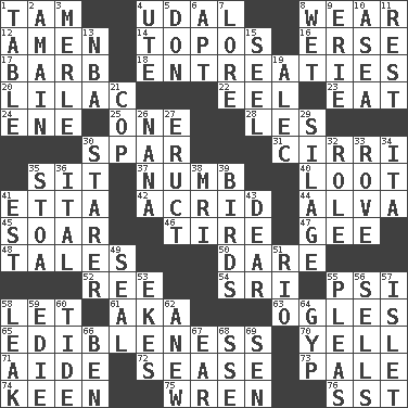 ACROSS 1. Scottish cap 4. Allodial 8. Erode 12. So be it 14. Traditional theme or motif 16. Celtic language 17. Sharp remark 18. Pleas 20. Pale purple color 22. Snakelike fish 23. Erode 24. Compass dir. 25. Single 28. French article 30. Practice fight 31. High-altitude cloud 35. Be seated 37. Unfeeling 40. Plunder 41. Singer James 42. Bitter 44. Inventor's middle name 45. Fly high 46. Hoop that covers a wheel 47. Turn to the right 48. Falsehoods 50. Have the gumption 52. To riddle 54. _ Lanka 55. Air pressure measure (abbr.) 58. Allow 61. Alias (abbr.) 63. Stares at amorously 65. The property of being fit to eat 70. Shout 71. Helper 72. Gospel singer Marvin 73. Diluted with white 74. Peachy ____! 75. Songbird 76. Fast jet (abbr.) DOWN 1. Eating place 2. At full speed 3. Haggard of country music 4. Shoshoni 5. Spanish title 6. Fitting 7. Old wives' tales, e.g. 8. Dripping 9. 4th largest of the Great Lakes 10. At sea 11. Remainder 13. Basketball assoc. 15. Sew up the eyelids of hawks and falcons 19. Actor Baldwin 21. Police officer (slang) 26. Nanny 27. Spew [out] 29. Fodder prepared in a silo 30. A viewer who gazes fixedly 32. Hero or heavy, e.g. 33. Be footloose 34. Call ___ day 35. Portico 36. Slanted text style (abbr.) 38. Medical imaging device (abbr.) 39. Avian creatures 41. Eastern Standard Time (abbr.) 43. Letter starter 49. Lick closed 51. River (Sp.) 53. Supplements with great effort 55. Entreaties 56. Exchanges for money 57. Small island 58. Path through which fluid escapes 59. Singer Brickell 60. Event that recurs at intervals 62. Afresh 64. Swindle 66. Benjamin's nick name 67. Ewer handle 68. Compass dir. 69. Elected rep.