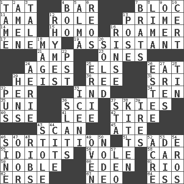 ACROSS 1. Make lace 4. Soap unit 7. Alliance 11. Wet nurse (var.) 12. Hero or heavy, e.g. 13. A-one 14. Cartoonist voice _ Blanc 15. Like (prefix) 16. Wanderer 17. Foe 19. Helper 21. Electrical Unit 23. Washington bills 24. Grows older 25. Raised railways 26. Consume 29. Robbery 30. Portuguese money of account (variant) 31. Indian title of respect (Mr.) 32. For each 33. Indiana (abbr.) 34. "___ Little Indians" 35. Single; one (prefix) 36. _-fi 37. Atmospheres 40. Compass dir. 41. Area sheltered from the wind 42. Become fatigued 43. Skim 45. Had dinner 46. Conclusion 51. Sadhe (variant) 55. Foolish or stupid persons 56. Short-tailed, large-bodied rat 58. Automobile 59. Having high moral qualities 60. Paradise 61. River (Sp.) 62. Celtic language 63. Modern: prefix 64. Double-curved letter DOWN 1. Docile 2. So be it 3. Falsehood 4. Oct. 31 cry 5. _ mater 6. Vintage cars 7. Naughty children 8. Pale green bean 9. Presage 10. Foregone conclusion 12. Poems 13. Introduce or present, as a question 16. Wash lightly 18. Wise men 20. Having a sole or soles 22. Pacific Standard Time (abbr.) 24. Nest on high 25. Bert's buddy 26. First name in cosmetics 27. Ancient Greek god of war 28. Metal container 29. Coop moms 32. Product of festering 33. Ancient Celtic tribe of eastern Britain 36. Narrow boards 37. R.R. building 38. Baby cat 39. Angers 43. Fur scarf 44. Quote 46. Trig term 47. Aroma 48. Teases 49. Baking chamber 50. Connecting point 52. Measure of real estate 53. Raised platform 54. Greek god of love 57. Lion