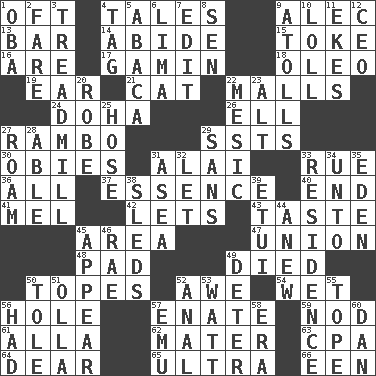 ACROSS 1. Often (poetically) 4. Lies 9. Actor Baldwin 13. Oblong piece of solid material 14. Stay 15. Puff or smoke 16. "We ___ not amused" (Victoria) 17. Street urchin 18. Margarine 19. Ewer handle 21. Domesticated feline 22. Promenades 24. Capital of the state of Qatar 26. Pipe bend 27. Role for Stallone 29. Fast planes 30. Off-Broadway awards 31. Mountain range southwest of Kyrgyzstan 33. Sorrow 36. Everything 37. Substance 40. Conclusion 41. Cartoonist voice _ Blanc 42. Allows 43. Clothes sense 45. Length times width 47. The state of being joined or united 48. Writing tablet 49. Passed on 50. Drinks excessively 52. Deep reverence 54. Soggy 56. Opening into or through something 57. Related on the mother's side 59. Allow head to fall sleepily 61. Silent film actress Nazimova 62. Mother 63. Tax preparer (abbr.) 64. Letter starter 65. Extreme 66. Car or cant ending DOWN 1. Chief or king in Benin or Nigeria 2. Conductor's collection 3. Excercise machine 4. Label 5. Phillipine bananalike plant 6. Pale green bean 7. Prepare for publication 8. Elected rep. 9. Ringlike coral islands and reefs 10. Hang loosely or laxly 11. Makes supply last 12. Corporate head (abbr.) 20. Loose flowing garment 22. Mesonic 23. Keyboard modifier key 25. Flexible conduit 27. Wander 28. Competent 29. Without 31. At sea 32. Allow 33. Home 34. To (old English) 35. Genesis locale 38. Bobsleighs 39. Needle holder 44. Afresh 45. Become visible 46. Actress Charlotte 49. Prevent from occurring 50. Lacquered or enameled metalware 51. Spanish pot 52. Of or related to the anus 53. Electrical Unit 55. Drink excessively 56. Possessed 57. Australian flightless bird 58. Epoch 60. One of the 12 tribes of Israel