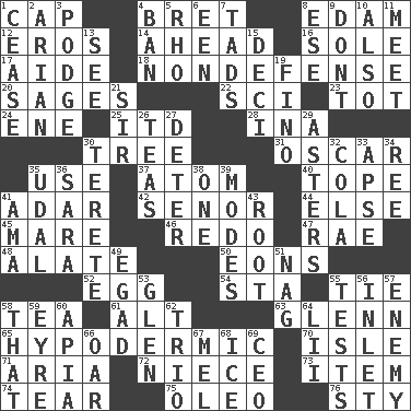ACROSS 1. Head covering 4. Cy Young winner Saberhagen 8. Dutch treat 12. Greek god of love 14. Forward in time 16. Not divided or shared with others 17. Helper 18. Unrelated to defense, as in spending 20. Gurus 22. _-fi 23. Small child 24. Compass dir. 25. It would 28. _ tizzy (2 wds.) 30. Relationship diagram 31. Witty Wilde 35. Purpose 37. Smallest unit of an element 40. Drink excessively 41. The sixth month of the Jewish calendar 42. Sir (Sp.) 44. Otherwise 45. Female horse 46. Redecorate 47. Actress Charlotte 48. Having winglike extensions 50. Immeasurably long periods of time 52. Oval reproductive body of a fowl 54. R.R. building 55. Make a knot 58. Afternoon social gathering 61. The first octave above the treble staff 63. American astronaut and politician John 65. Subcutaneous 70. Small island 71. Operatic vocal solo 72. Sibling's daughter 73. A distinct part 74. Pull into pieces 75. Margarine 76. Filthy place DOWN 1. Stop 2. Believer in; advocate of (suffix) 3. Plash 4. Prohibit 5. 17th letter of the Greek alphabet 6. Car or cant ending 7. Bits 8. Compass dir. 9. Do not 10. In addition 11. Confront 13. Perceive with the eye 15. Tenth: prefix 19. A pale, very dry sherry 21. Title for a knight 26. Afternoon social gatherings 27. Prevent from occurring 29. Michaelmas daisies 30. Cigar-shaped 32. Root beer relative 33. Domed church section 34. To riddle 35. Freehold land 36. "Two Mules for Sister ____" 38. Single 39. Methods 41. Nursemaid (var.) 43. Carrot, for example 49. Mild oath 51. Tired old horse 53. Small, secluded valley 55. Trials 56. An arm off of a larger body of water 57. Foe 58. Not this but _ 59. Jane of fiction 60. Capital of Western Samoa 62. Musical group of three 64. Cards in a Roman deck? 66. Boat paddle 67. Cartoonist voice _ Blanc 68. Frozen water 69. Corporate head (abbr.)