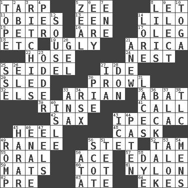 ACROSS 1. Canvas cover 5. Last letter of the English alphabet 8. Allow 11. Off-Broadway awards 13. Car or cant ending 14. _ and Stitch 15. Stone: prefix 16. "We ___ not amused" (Victoria) 17. Cassini of fashion 18. And so on (abbr.) 19. Repulsive 21. N. Chile seaport 22. Flexible conduit 24. A home for chicks 25. A glass for beer 27. Binary compound 29. Downhill vehicle 30. Move like a hungry wolf 32. Otherwise 33. Believer in; advocate of (suffix) 35. Blind as ____ 39. Wash lightly 41. Give a ring to 42. Saxophone 43. Medicinal drug used to evoke vomiting 45. The bottom of a shoe or boot 48. Keg 49. The wife of a rajah (variant) 50. Proofreading order 52. Scottish cap 55. Of the mouth 56. Adept person 57. Peak District village in England 59. Floor protectors 60. Small child 61. Thermoplastic polyamide 62. Before (prefix) 63. Had dinner 64. Makes supply last DOWN 1. Drink excessively 2. Collude with 3. Actors Guy, Robert Welles, and Clint 4. For each 5. Ardor 6. Suggestive of the supernatural 7. Compass dir. 8. Ms. Damita and namesakes 9. Opt 10. Ancient Roman robe 12. Boozer 14. Old wives' tales, e.g. 20. Set 21. Afresh 23. More peculiar 25. Compass dir. 26. Pipe bend 27. Lyricist Gershwin 28. Spanish title 30. Sliced dessert 31. Shoestrings 33. Santa ___, CA 34. Acura sports coupe 36. Sass 37. According to 38. Affectionate concern, for short 40. Small island 43. Frozen water 44. Eucharist need 45. Ethiopian city, capital of Harari 46. Maternal 47. Snakelike fish 49. Frolic 50. Native of Scotland 51. False hair 53. Medicinal plant 54. Not women's 56. _ moment's notice (2 wds.) 58. Color