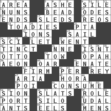 ACROSS 1. Length times width 5. American tennis player Robert 9. Drop; flow; fall 13. Religious women 14. Necklace unit 15. Lyric poems 16. Conclusions 17. Bobsleighs 18. Vintage cars 19. Sycophants 21. Parent Teacher Assoc. 22. Charged particles 23. Travel by water 24. _-fi 27. Allow 28. Gone 29. Colored lightly or faintly 31. Compass dir. 32. Is not 36. "Beetle Bailey" pooch 37. Pull behind 38. Brightly colored fish 39. Period of immesurable duration 40. Rowing implement 41. Related on the mother's side 42. Become taut 44. For each 46. Marina Del _, California 47. Roberta Peters solo 48. Israeli folk dance 50. Luau course 51. Eat 54. The Jewish people; Israel 56. Narrow boards 58. Hero or heavy, e.g. 60. Left side of a ship or aircraft 61. Grain storage tower 62. Hereditary estate 63. Pismires 64. Snakelike fish 65. Not women's DOWN 1. A saturated hydrocarbon 2. Undersized animal 3. Inside; within (prefix) 4. Slender Brazilian palm 5. Most capable 6. Observes 7. Possessed 8. Begley and Asner 9. Drawing lots 10. Standard of perfection 11. Lion 12. Double-curved letter 17. Trig term 20. Dunce 21. Baking dish 23. Observe 24. Portico 25. Quote 26. To the inside or interior of 28. Compass dir. 30. Meets 31. And not 33. Practice fight 34. Nathan's nickname 35. Those people 37. Scottish cap 40. Mouth or opening 41. Blunders 43. One more than two 44. Pictures 45. Immeasurably long periods of time 47. To the left, to Queeg 49. Gold (Symbol: Au) 51. Give a ring to 52. Method 53. Flair 54. Health resort 55. Electrically charged atom 56. Compass dir. 57. Untruth 59. Raised railways