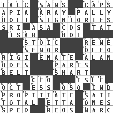 ACROSS 1. Baby powder 5. Without 9. Balmoral and tarboosh 13. Capital of Western Samoa 14. Like ___ of sunshine 15. Chummy 16. Dunce 17. Seigniories (variant) 19. _ Lanka 20. White ___ sheet 21. Music discs 22. Make lace 23. Russian ruler of old 25. Being at a high temperature 26. Unemotional 30. French philosopher Descartes 34. Sir (Sp.) 35. Margarine 36. Swiss mountan, "Queen of the Mountains" 39. Maternal 42. Actor Alda or Thicke 43. Lyric poems 44. Actors' quests 46. Waist strap 47. Don Adams' spy role 48. Corporate head (abbr.) 51. Small island 54. Sep. follower 57. Double-curved letter 58. Bear (Spanish) 60. Indiana (abbr.) 62. Conciliate 65. Suttee (variant) 66. Add up to 67. Singer James 68. Washington bills 69. Drove too fast 70. Vintage cars 71. Drug cop DOWN 1. Small boys 2. To the left, to Queeg 3. Ms. Damita and namesakes 4. Feline 5. Backtalk 6. Operatic vocal solo 7. Tired old horse 8. Synchronize (abbr.) 9. 4-wheeled motor vehicle 10. Came down and settled, as after flight 11. Entreaty 12. System (abbr.) 15. Mail 18. Wedding promise 20. Johnson of "Laugh-In" 24. Aid 27. Single 28. Electrically charged atom 29. Dice game 30. Cooks with dry heat, as in an oven 31. Pipe bend 32. Teachers' org. 33. A really long time 36. Director Reiner 37. Binary compound 38. Set 40. Scottish cap 41. Epoch 45. Musical group of three 48. To provide with a ceiling 49. Eastern Standard Time (abbr.) 50. Flexible twig of a willow tree 52. Climbing, woody, usually tropical vines 53. Keyboard key 54. Elects 55. Riding implement 56. Haul 58. Von Bismarck 59. Oceans 61. Flat circle 63. Writing tablet 64. Had dinner 65. Manchild