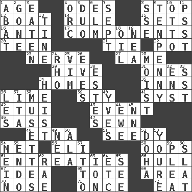 ACROSS 1. Personal question 4. Lyric poems 8. Close up, plug up 12. Water vessel 14. Governing power 15. Puts into a specified state 16. Against 17. Parts 20. Adolescent 21. Make a knot 22. Plant holder 23. Impudent aggressiveness 27. Unable to walk 29. Hub of activity 31. Washington bills 34. Dwellings 35. Taverns 36. Citrus frut 39. Filthy place 41. System (abbr.) 42. Needle case 43. Incident 46. Backtalk 47. Stitched 48. Inactive volcano in Sicily 51. Morally degraded 54. Was introduced to 56. Connecticut Ivy Leaguer 58. I made a mistake 61. Pleas 66. Frame or body of a ship 67. The content of cognition 68. Haul 69. Type of rug 70. Characteristic smell of wine 71. Single time 72. Erode DOWN 1. Blind as ____ 2. Went 3. Eroded 4. The grampus (Milton) 5. Superhero pair 6. Shade tree 7. Back-to-school mo. 8. Compass dir. 9. 3-inch nail 10. "Beetle Bailey" pooch 11. Inconspicuous attention getter 13. Prong on a fork 18. Lubricate 19. Teachers' org. 24. 17th letter of the Greek alphabet 25. Zeal 26. Nights before holidays 28. Damp 30. _____ Park, CO 32. Followers of ems 33. Fast jet (abbr.) 34. Robbery 36. French article 37. Call ___ day 38. French bagpipes 40. Jacques Cousteau's middle name 44. She-sheep 45. Compass dir. 49. Born 50. In the manner of 52. Capital of the state of Qatar 53. You are 54. Count _ (2 wds.) 55. Inside; within (prefix) 57. "Tell ____ the Marines!" 59. Entreaty 60. Narrow board 62. Actress Charlotte 63. Electrically charged atom 64. And so on (abbr.) 65. Observe