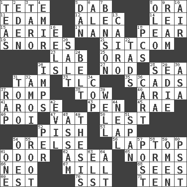 ACROSS 1. Wig 5. Apply (a substance) by light strokes 8. Mouth or opening 11. Dutch treat 12. Actor Baldwin 14. Luau accessory 15. Nest on high 17. Grandmother 18. Lightbulb-shaped fruit 19. Sounds asleep 21. "Cheers" or "Ellen" 23. Experiment locale 25. Mouths or openings 26. Capri or Wight 27. Allow head to fall sleepily 28. Ocean 31. Scottish cap 33. Affectionate concern, for short 35. Oodles 37. Play 38. Pull behind 40. Roberta Peters solo 41. Came up 43. Fenced enclosure 45. Actress Charlotte 46. Luau course 47. Large container 50. For fear that 52. Expression of disdain 53. Infant locale 54. Threatening words 56. Portable computer 61. Aroma 62. At sea 65. Typical models 66. Modern: prefix 67. Place where flour is made 68. Perceives with the eye 69. Eastern Standard Time (abbr.) 70. Fast jet (abbr.) 71. Portable shelter DOWN 1. Beverages made from leaves 2. Paradise 3. Edible starchy tuberous root 4. Arab leader 5. One of the 12 tribes of Israel 6. Insect wing 7. Gillaume's butler role 8. Butter sub 9. 480, 500 or 516 sheets of paper 10. Wind 13. Capital of Egypt 16. Snakelike fish 18. Personal Computers (abbr.) 20. Table seasoning 22. Bits 24. Waist strap 26. Naughty children 28. "Two Mules for Sister ____" 29. Singer Brickell 30. White ___ sheet 31. "Corrida" creature 32. Mine, in Marseilles 34. Police officer (slang) 36. Draw slowly or heavily 37. Reproach for some lapse or misdeed 39. Water source 42. Tending to cause great harm 44. Actress Patricia 48. Indian state 49. College paper 51. Connect, as a bridge 52. For each 54. Lyric poems 55. Carrot, for example 57. Mail 58. Woody plant 59. Presage 60. Inconspicuous attention getter 61. Single 63. Raised railways 64. The first octave above the treble staff