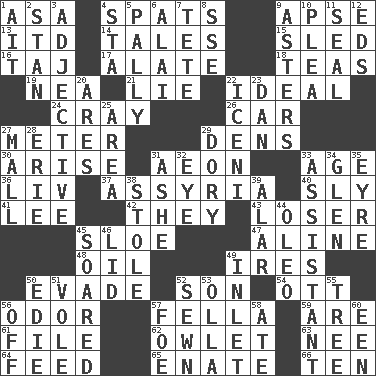 ACROSS 1. White ___ sheet 4. Arguments over trivial matters 9. Domed church section 13. It would 14. Stories 15. Downhill vehicle 16. _ Mahal 17. Having winglike extensions 18. Beverages made from leaves 19. Teachers' org. 21. Untruth 22. Standard of perfection 24. Supercomputer manufacturer 26. 4-wheeled motor vehicle 27. Distance measurement 29. Hiding places for outlaws 30. Get up 31. A really long time 33. Personal question 36. 54 in ancient Rome 37. Nineveh was its capital 40. Playfully artful 41. Area sheltered from the wind 42. Those people 43. Failure 45. _ gin 47. Place in a line 48. Petroleum 49. Angers 50. Dodge 52. Male child 54. Baseball player Mel 56. Scent 57. Chap (slang) 59. "We ___ not amused" (Victoria) 61. Do some clerical work 62. A small or young owl 63. Born 64. Nourish 65. Related on the mother's side 66. Nine, plus one DOWN 1. Small island 2. Comedian Laurel of Laurel & Hardy 3. Descriptive word 4. R.R. building 5. Friendly 6. Mountain range southwest of Kyrgyzstan 7. Wig 8. Compass dir. 9. Michaelmas daisies 10. Entreaty 11. Lick closed 12. Begley and Asner 20. Ancient Greek god of war 22. Ancient Celtic tribe of eastern Britain 23. One of the 12 tribes of Israel 25. Length times width 27. Promenade 28. 4th largest of the Great Lakes 29. Rowboat 31. American tennis player Robert 32. Sight organ 33. Aide 34. Small, secluded valley 35. Jane of fiction 38. Took without asking 39. Having or resembling wings 44. Butter sub 45. Flew 46. Flaplike covering 49. An arm off of a larger body of water 50. Singer Brickell 51. Grand slam 52. Stitched 53. Spanish pot 55. Relationship diagram 56. Below a satisfactory level 57. Enemy 58. Had dinner 60. Car or cant ending