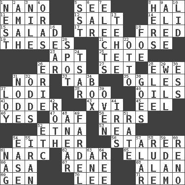 ACROSS 1. Billionth: prefix 5. Observe 8. Actor Linden 11. Arab leader 12. Table seasoning 14. Biblical high priest 15. Vegetable dish 17. Family _ (genealogy) 18. Flintstone 19. College papers 21. Opt 23. Fitting 25. Wig 26. Greek god of love 27. Put into a specified state 28. She-sheep 31. And not 33. Keyboard key 35. Stares at amorously 37. Farming town in central California 38. Friend of Pooh 40. Lubricates 41. More peculiar 43. 16 45. Snakelike fish 46. It is so 47. Clumsy lout 50. Blunders 52. Inactive volcano in Sicily 53. Teachers' org. 54. One or the other 56. A viewer who gazes fixedly 61. Drug cop 62. The sixth month of the Jewish calendar 65. Evade 66. White ___ sheet 67. French philosopher Descartes 68. Actor Alda or Thicke 69. Commissioned military rank (abbr.) 70. Area sheltered from the wind 71. San ____ (Riviera town) DOWN 1. A home for chicks 2. Nanny 3. The longest river in the world 4. Mouths or openings 5. Fast jet (abbr.) 6. Ewer handle 7. Opts 8. Possessive pronoun 9. Toward shelter 10. Hat (slang) 13. Giggle 16. Letter starter 18. Enemy 20. Blemish 22. "Beetle Bailey" pooch 24. Russian ruler of old 26. 4th largest of the Great Lakes 28. Writer Wiesel 29. Water source 30. Double-curved letter 31. Connecting point 32. Likelihood 34. Gift holder 36. Moves 37. Myrna of the movies 39. Baking chamber 42. Writer of Portnoy's Complaint (1969) 44. Angers 48. Approach 49. Burden 51. Pace 52. And so on (abbr.) 54. Relaxation 55. SW Asia republic 57. Having or resembling wings 58. Governing power 59. Dutch treat 60. Western Nevada city 61. Tired old horse 63. A saturated hydrocarbon 64. Portuguese money of account (variant)