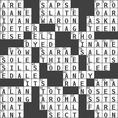 ACROSS 1. "We ___ not amused" (Victoria) 4. Plant excrements 8. Adept person 11. Object of repulsion 13. Schedule 15. Boat paddle 16. "Terrible" tsar 17. Make _____ (do battle with) 18. "____ silly question..." 19. Prevent from occurring 21. Label 22. Adolescent 23. Compass dir. 24. Biblical high priest 27. 17th letter of the Greek alphabet 29. Colored 30. Lacking in sense or substance 34. Solemn pledge 36. "Two Mules for Sister ____" 39. Vegetable dish 40. Not divided or shared with others 41. One or ones belonging to thee 43. Allows 44. Beverly of Met fame 46. Wrote a lyric poem 47. Area sheltered from the wind 48. Peak District village in England 49. "60 Minutes" Commentator Rooney 51. It is 53. Actress Charlotte 54. Housemaid (var.) 57. Actor Alda or Thicke 60. Small child 63. Olfactory organs 65. Protracted 66. Scent 69. Fast planes 70. Floor protector 71. Relating to or accompanying birth 72. Conductor's collection 73. Cuckoo 74. Religious group 75. Electrically charged atom DOWN 1. Stay 2. All-night dance parties 3. Maternal 4. Compass dir. 5. Insect wing 6. Component 7. Portico 8. Introduce or present, as a question 9. Immoral or dissolute person 10. NW Algerian seaport 12. Compass dir. 14. Engineer (abbr.) 18. Without tonality 20. Marina Del _, California 25. For fear that 26. Potato state 28. Part of HMS, perhaps 29. Home 31. Toward shelter 32. Nathan's nickname 33. Begley and Asner 34. Null 35. Water jar 37. To free from 38. Approach 40. Compass dir. 42. Pulitzer Prize-winning author Ferber 45. Arrange properly for use 50. Lair 52. Comedian Laurel of Laurel & Hardy 54. Slender Brazilian palm 55. Paris' subway 56. NE Netherlands city 57. _ mater 58. Grant temporary use of 59. Opposed to 61. Mouths or openings 62. Haul 64. Order of Saint Francis (abbr.) 67. Apple computer (short form) 68. Keyboard modifier key