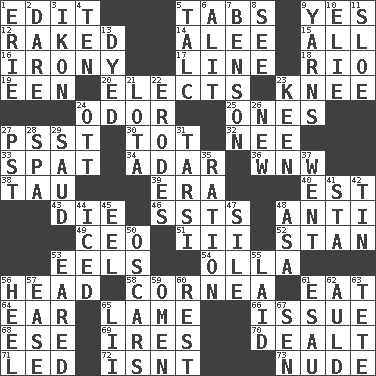 ACROSS 1. Prepare for publication 5. Bar bills 9. Consenting reply 12. Swept the length of 14. Toward shelter 15. Everything 16. Literary sarcasm 17. Actor's bit 18. River (Sp.) 19. Car or cant ending 20. Opts 23. Leg joint 24. Scent 25. Washington bills 27. Inconspicuous attention getter 30. Small child 32. Born 33. Petty quarrel 34. The sixth month of the Jewish calendar 36. Compass dir. 38. The 19th letter of the Greek alphabet 39. Period 40. Eastern Standard Time (abbr.) 43. Expire 46. Fast planes 48. Opposed to 49. Corporate head (abbr.) 51. One more than two 52. Comedian Laurel of Laurel & Hardy 53. Snakelike fish 54. Spanish pot 56. Froth on beer 58. Pupil covering 61. Erode 64. Hearing organ 65. Unable to walk 66. Come out of 68. Compass dir. 69. Angers 70. Started a card game 71. Directed 72. Is not 73. Unadorned DOWN 1. 4th largest of the Great Lakes 2. Have the gumption 3. Visual representation of an object 4. "___ Little Indians" 5. Baby powder 6. Set down 7. Gillaume's butler role 8. Perceive with the eye 9. Entertaining tales 10. Writer Wiesel 11. A type of plum 13. Colored 21. Globular water bottle used in Asia 22. Eats (away) 23. Peachy ____! 24. Baseball player Mel 26. ___ Haven, CT 27. Pacific Standard Time (abbr.) 28. Health resort 29. Saudi Arabian king (1953-1964) 31. Tarsus (plural) 35. Food allowance for one day 37. Gone 41. R.R. building 42. Metal container 44. On the rocks 45. Snakelike fish 47. Filth; sediment 48. White ___ sheet 50. Motion picture awards 53. Having ears or earlike features 55. Put down 56. The bottom of a shoe or boot 57. Comfort 59. Presage 60. State of inaction 61. Son of Isaac 62. Old (Scot.) 63. Wig 65. Cards in a Roman deck? 67. Elected rep.