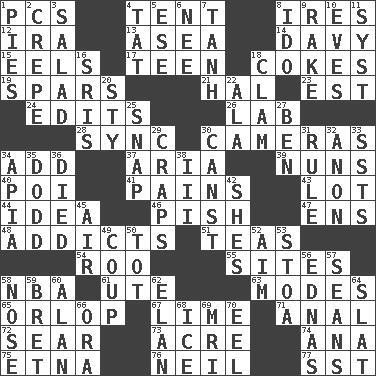 ACROSS 1. Personal Computers (abbr.) 4. Portable shelter 8. Angers 12. Retirement account (abbr.) 13. At sea 14. _ Jones' Locker 15. Snakelike fish 17. Adolescent 18. Popular sodas 19. Practice fights 21. Actor Linden 23. Eastern Standard Time (abbr.) 24. Proofreads 26. Experiment locale 28. Synchronize (abbr.) 30. Devices for capturing images 34. Find the sum of 37. Roberta Peters solo 39. Religious women 40. Luau course 41. Aches 43. Car dealer's back yard 44. The main thing one is thinking about 46. Expression of disdain 47. Followers of ems 48. Inveterate users 51. Beverages made from leaves 54. Friend of Pooh 55. Locates 58. Basketball assoc. 61. Shoshoni 63. Methods 65. Fourth or lowest deck 67. Citrus frut 71. Of or related to the anus 72. Scorch 73. 43,560 square feet 74. Santa ___, CA 75. Inactive volcano in Sicily 76. Famous astronaut Armstrong 77. Fast jet (abbr.) DOWN 1. Sliced desserts 2. Streamer paper 3. First course 4. Make lace 5. Compass dir. 6. Born 7. Hyperbolic tangent 8. Wedding promise 9. Immoral or dissolute person 10. Nights before holidays 11. System (abbr.) 16. Indian titles of respect 18. Burrowing marine mollusk 20. Filthy place 22. Chicken ___ king 25. Fastener 27. Benjamin's nick name 29. Dice game 30. 2nd pers. sing. pres. of can (arch.) 31. Court order 32. Soon (poet.) 33. Fast planes 34. Capital of Western Samoa 35. Texas town _ City 36. Passed on 38. One more than two 42. "______ My Girl" (Turtles hit) 45. Wind 49. Overturn; upset 50. Small child 52. Direct toward a target or goal 53. Portico 56. Ferber et al. 57. Actors Connery and Penn 58. Sense of smell 59. Cy Young winner Saberhagen 60. Actor Alda or Thicke 62. Style 64. Narrow board 66. Mouth or opening 68. Frozen water 69. Medical imaging device (abbr.) 70. Snakelike fish