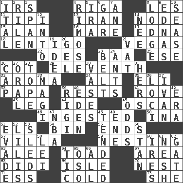 ACROSS 1. Big collection agency 4. Port city in Latvia 8. French article 11. Native american tent (variation) 13. SW Asia republic 14. Thickened enlargement 15. Actor Alda or Thicke 16. Female horse 17. Pulitzer Prize-winning author Ferber 18. Small, flat, pigmented spot on the skin 21. Viva Las _ 22. Lyric poems 23. Sound made by sheep 25. Compass dir. 26. Small bed 29. Veterans Day date 32. Scent 34. The first octave above the treble staff 35. Biblical high priest 38. Dad 39. Musical pauses 41. Be footloose 43. Part of a journey 44. Binary compound 45. Witty Wilde 46. Eaten 50. _ tizzy (2 wds.) 51. Raised railways 54. Storage container 55. Extremities 57. Country estate 59. Nestling 63. Toward shelter 64. Frog relative 67. Length times width 68. "You Light Up My Life" star Conn 69. Small island 70. A home for chicks 71. Curvy letter 72. Lacking warmth 73. A female animal or person DOWN 1. Slanted text style (abbr.) 2. Cause heat under the collar 3. Connect, as a bridge 4. Full of chinks, cracks, or crevices 5. Lyricist Gershwin 6. Slender fish 7. A saturated hydrocarbon 8. Inn 9. Ferber et al. 10. Gospel singer Marvin 12. To the inside or interior of 14. Born 19. The content of cognition 20. Set 21. Large container 23. Waist strap 24. Pismires 26. Head covering 27. Taken by mouth 28. Drink excessively 30. Flower holders 31. Possessive pronoun 33. Wise men 36. Locales 37. "Terrible" tsar 39. Swiss mountan, "Queen of the Mountains" 40. Locale of original sin 42. Epoch 45. Likelihood 47. Basketball assoc. 48. Watched over 49. Compass dir. 51. Dodge 52. Ms. Damita and namesakes 53. Bobsleighs 56. Comedian Laurel of Laurel & Hardy 58. Luau accessory 60. Angers 61. Tender 62. Yard entry 64. Nervous spasm 65. Bear (Spanish) 66. Everything