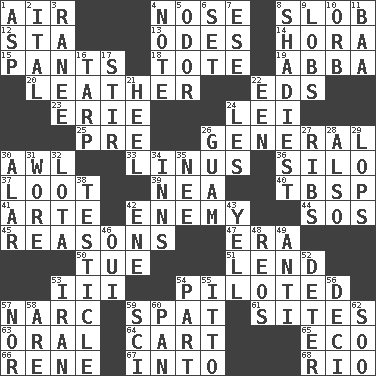 ACROSS 1. Wind 4. Olfactory organ 8. Oscar Madison type 12. R.R. building 13. Lyric poems 14. Israeli folk dance 15. Leg coverings 18. Haul 19. Swedish rock group 20. Cordwainer's material 22. Begley and Asner 23. One of the Great Lakes 24. Luau accessory 25. Before (prefix) 26. Commissioned military rank 30. Leather borer 33. "_ and Lucy" (Charlie Brown theme song) 36. Grain storage tower 37. Spoils 39. Teachers' org. 40. Cook's measure (abbr.) 41. Johnson of "Laugh-In" 42. Foe 44. Distress signal 45. Thinks logically 47. Epoch 50. Third day of the wk. 51. Grant temporary use of 53. One more than two 54. Manned the helm 57. Drug cop 59. Argument over a trivial matter 61. Settings 63. Of the mouth 64. Haul 65. Environmental prefix 66. French philosopher Descartes 67. To the inside or interior of 68. River (Sp.) DOWN 1. Viper 2. Slanted text style (abbr.) 3. The wife of a rajah (variant) 4. Observe 5. Aroma 6. Arrange properly for use 7. Compass dir. 8. Most dark, concealed or hidden 9. Tennis shots 10. Globe 11. Sound made by sheep 16. Canvas cover 17. Use a spoon 21. The bottom of a shoe or boot 22. Car or cant ending 24. French article 26. Island territory of the United States 27. Chest bones 28. In addition 29. Chops off 30. Having or resembling wings 31. Had on 32. Globular water bottle used in Asia 34. Taverns 35. Born 38. A testis 42. Compass dir. 43. Shout 46. Fr. "Yes" 48. Vintage cars 49. Against 52. Prevent from occurring 53. SW Asia republic 54. Role in a play 55. "Tell ____ the Marines!" 56. Tenth: prefix 57. Not either 58. "We ___ not amused" (Victoria) 59. _-fi 60. Baking dish 62. "Barney Miller" actor Jack