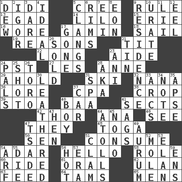 ACROSS 1. "You Light Up My Life" star Conn 5. Algonquian 9. General guideline 13. Mild oath 14. _ and Stitch 15. One of the Great Lakes 16. Had on 17. Street urchin 18. Move on water 19. Thinks logically 21. Teat (slang) 22. Having great length 23. Helper 24. Pacific Standard Time (abbr.) 27. French article 28. Singer Murray 29. Hold, grip (Informal) 31. What Jean-Claude Killy likes to do 32. Grandmother 36. Old wives' tales, e.g. 37. Tax preparer (abbr.) 38. Riding implement 39. Portico 40. Sound made by sheep 41. Religious groups 42. Son of Odin 44. Santa ___, CA 46. Observe 47. Those people 48. Ancient Roman robe 50. Elected rep. 51. Ingest 54. The sixth month of the Jewish calendar 56. Phone greeting 58. Hero or heavy, e.g. 60. Travel on or in a vehicle 61. Taken by mouth 62. Uhlan (variant) 63. Nourish 64. Scottish caps 65. Not women's DOWN 1. Morning condensation 2. Composer Stravinsky 3. Have the gumption 4. Perfect 5. Gives out a loud, resonant sound 6. Basketball hoops 7. Connecticut Ivy Leaguer 8. Period of immesurable duration 9. Home 10. A salt of uric acid 11. Cards in a Roman deck? 12. Snakelike fish 17. Went 20. Exchanged or delivered for money 21. Metal container 23. Black tropical American cuckoo 24. Friends 25. Opportunity 26. "Corrida" creature 28. Alias (abbr.) 30. Resembling or made to resemble leather 31. Health resort 33. Arches 34. Short letter 35. Domed church section 37. Automobile 40. Male child 41. Droops 43. Layer 44. Ringlike coral islands and reefs 45. Words to Nanette 47. Sadhe (variant) 49. Gold (Symbol: Au) 51. Dollar (slang) 52. Undercover agent 53. Liveliness 54. Sandy's bark 55. Pass on 56. Being at a high temperature 57. Period 59. Followers of ems