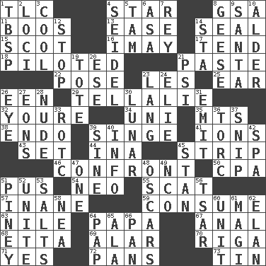 ACROSS 1. Affectionate concern, for short 4. Play the lead 8. Girls' org. (abbr.) 11. Expressions of contempt or scorn 13. Relaxation 14. Lick closed 15. Highlander 16. "If ____ say so..." 17. Watch over 18. Manned the helm 21. Thick mixture 22. Airs 23. French article 25. Hearing organ 26. Car or cant ending 29. Copy Pinocchio 32. You are 34. Single; one (prefix) 35. Mountains (abbr.) 38. Inside; within (prefix) 39. Scorch 41. Charged atoms 43. Arrange properly for use 44. _ tizzy (2 wds.) 45. Remove all contents or possession from 46. Meet 50. Tax preparer (abbr.) 51. Product of festering 54. Modern: prefix 55. Leave at once 57. Lacking in sense or substance 59. Ingest 63. Mediterranean tributary 64. Dad 67. Of or related to the anus 68. Singer James 69. Having or resembling wings 70. Capital of Latvia 71. Consenting reply 72. Baking dishes 73. Metal container DOWN 1. Cook's measure (abbr.) 2. Venues 3. Calm and collected 4. A glass for beer 5. Scottish cap 6. White ___ sheet 7. Marina Del _, California 8. Honkers 9. Before Barbara or Clara 10. Tree or shrub in the Birch family 12. Close up, plug up 14. R.R. building 19. Carryall 20. Compass dir. 21. 23rd letter of the Greek alphabet 23. Long (Scottish) 24. Writer Wiesel 26. Sight organ 27. Immeasurably long periods of time 28. Unadorned 30. Type of eclipse 31. Give off 33. College mil. group 36. Torque (variant) 37. Clip 39. Trig term 40. Information 42. Health resort 45. Comedian Laurel of Laurel & Hardy 47. Single 48. Motion picture awards 49. Non-commissioned officer (abbr.) 51. Abounding in pines 52. Join together 53. Table seasonings 56. Russian ruler of old 58. Teachers' org. 60. A single undivided whole 61. Wise men 62. Style 64. Infant food 65. Chicken ___ king 66. Baking dish