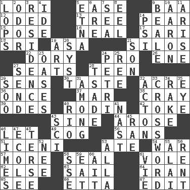 ACROSS 1. Australian parrot (variant) 5. Comfort 9. Sound made by sheep 12. Wrote a lyric poem 13. Relationship diagram 14. Lightbulb-shaped fruit 15. Airs 16. Be tempered by heat 17. Indian skirt 18. Indian title of respect (Mr.) 19. White ___ sheet 21. Grain storage towers 22. Small, narrow, flatbottom fishing boat 24. Adept person 26. Compass dir. 27. Theater features 28. Adolescent 29. Elected reps. 30. Clothes sense 32. Land measure 36. Single time 37. Spoil 38. Supercomputer manufacturer 39. Lyric poems 40. "The Thinker" sculptor 42. Puff or smoke 43. Trig term 44. Came up 46. Allow 49. Gear tooth 50. Without 51. Ancient Celtic tribe of eastern Britain 53. Had dinner 54. Armed conflict 57. Greater amount 58. Lick closed 61. Grand slam 62. Otherwise 63. Travel by water 64. SW Asia republic 65. Perceive with the eye 66. Singer James 67. Prepare for publication DOWN 1. Chops off 2. Aroma 3. Dwelling 4. Binary compound 5. Inactive volcano in Sicily 6. "We ___ not amused" (Victoria) 7. Ocean 8. Snakelike fish 9. Calif. Air Force Base 10. Composer Copland 11. Ascend 14. Air pressure measure (abbr.) 19. Nonscientific branch of learning 20. System (abbr.) 21. Manchild 23. Fertile tracts in a desert 24. _ dish (used to culture cells) 25. Portuguese money of account (variant) 27. Post 28. Sadhe (variant) 29. "Barney Miller" actor Jack 31. Amid 32. NE Massachussets city 33. What you're doing now 34. Libertine 35. Sight organ 40. _ de Janeiro 41. Political cartoonist Thomas 43. _-fi 45. Actress Charlotte 46. Citrus fruits 47. Learning spot: Fr. 48. Laconic 52. Born 53. Silent film actress Nazimova 55. Jai ____ 56. Monthly bill 58. Compass dir. 59. Consume 60. Small island 61. Compete