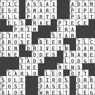 ACROSS 1. Nervous spasm 4. Slender Brazilian palm 9. First of billions? 13. Compass dir. 14. Don Adams' spy role 15. Corncob 16. 100% 17. Pieces 18. Inconspicuous attention getter 19. Raised railways 21. Actress Charlotte 22. Part 24. Demure 26. Epoch 27. Value system 29. Play the lead 30. Came up 31. Fermented drink made from hops 33. Affectionate concern, for short 36. Elected rep. 37. Popular '50s hangout 40. Boat paddle 41. Supplement with great effort 42. Lyric poems 43. Lacking in sense or substance 45. Bits 47. Cabin 48. She-sheep 49. Not women's 50. Monte _, Las Vegas Hotel/Casino 52. Lion 54. Baseball player Mel 56. Flatfish 57. Avian creatures 59. Globe 61. Mail 62. Fertile tracts in a desert 63. Fr. "Yes" 64. _ vera 65. Take or capture by force 66. Part of a journey DOWN 1. Beverage made from leaves 2. Small island 3. Portable communications device 4. Cleo's killer 5. Excessive but superficial compliments 6. "Two Mules for Sister ____" 7. Johnson of "Laugh-In" 8. ___ a Wonderful Life 9. Seem 10. Compact _ 11. Domed church section 12. Was introduced to 20. Indian titles of respect 22. _ dish (used to culture cells) 23. Retirement account (abbr.) 25. On the rocks 27. Comfort 28. Long journey 29. Perceives with the eye 31. Auction offers 32. Night before a holiday 33. Inedible or poisonous agaric 34. Austrian-born American filmmaker Fritz 35. Algonquian 38. Cowboy competition 39. Mediterranean tributary 44. Words to Nanette 45. Cigar-shaped 46. Leather borer 49. Methods 50. Calm and collected 51. In addition 52. One who doesn't tell the truth 53. Celtic language 55. Loyal 56. Health resort 57. Ribbon knot 58. Fast jet (abbr.) 60. Large