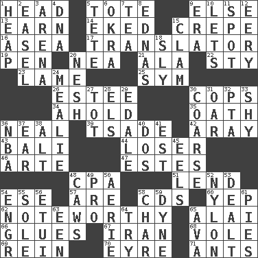 ACROSS 1. Froth on beer 5. Lug 9. Otherwise 13. Merit 14. Made supply last 15. Streamer paper 16. At sea 17. Interpreter 19. Writing instrument 20. Teachers' org. 21. Insect wing 22. Filthy place 23. Unable to walk 25. Symbol (abbr.) 26. First name in cosmetics 30. 911 reaches them 34. Hold, grip (Informal) 35. Pledge 36. Actress Patricia 39. Sadhe (variant) 42. Like ___ of sunshine 43. Indonesian resort city 44. Failure 46. Johnson of "Laugh-In" 47. _____ Park, CO 48. Tax preparer (abbr.) 51. Grant temporary use of 54. Compass dir. 57. "We ___ not amused" (Victoria) 58. Music discs 60. Slangy assent 62. Music shop? 65. Jai ____ 66. Cements 67. SW Asia republic 68. Grand slam 69. It's straight from the horse's mouth 70. Jane of fiction 71. Pismires DOWN 1. Pile 2. Artist's stand 3. Sports stadium 4. Heredity factor (abbr.) 5. False hair 6. Gumbo ingredient 7. Afternoon social gathering 8. Ferber et al. 9. Epoch 10. Allows 11. Specific locale 12. Suggestive of the supernatural 15. Dollar (slang) 18. Cunning 20. Soft 24. Ear of corn 27. Small child 28. Raised railways 29. Peak District village in England 30. Rough 31. Boat paddle 32. Parent Teacher Association (abbr.) 33. Like a shrinking violet 36. Basketball assoc. 37. Ewer handle 38. Keyboard modifier key 40. Two (Sp.) 41. Eastern Standard Time (abbr.) 45. Snakelike fish 48. Crow sounds 49. Adept person 50. Nest on high 52. Thermoplastic polyamide 53. Started a card game 54. Engineer (abbr.) 55. Not divided or shared with others 56. Needle case 58. Burn to charcoal 59. Centimeter-gram-second unit of force 61. Sliced desserts 63. Car or cant ending 64. Attempt to accomplish something 65. Actress Gardner