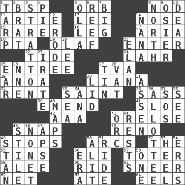 ACROSS 1. Cook's measure (abbr.) 5. Globe 8. Lower and raise head in agreement 11. Nick name for Arthur 13. Luau accessory 14. Sense of smell 15. More valued for its uncommonness 16. Part of a journey 17. Operatic vocal solo 18. Parent Teacher Assoc. 19. Norwegian king 21. Keyboard key 22. Event that recurs at intervals 24. Cowardly lion portrayer 25. Main course 27. Federal power corp. 29. Small Philippine buffalo 30. Woody, climbing, usually tropical plant 32. Monthly bill 33. Virtuous person 35. Backtalk 39. Make improvements or corrections to 41. _ gin 42. Auto club (abbr.) 43. Threatening words 45. Fastener 48. Western Nevada city 49. Halts 50. Curves 52. Definite Article 55. Airtight sealed metal containers 56. Connecticut Ivy Leaguer 57. Carrier 59. Toward shelter 60. To free from 61. Scornful expression 62. Fish or hair follower 63. Had dinner 64. Snakelike fish DOWN 1. Canvas cover 2. Naughty child 3. Ski resort town in Vermont 4. Sliced dessert 5. Rounded earthenware pot or jar 6. Coral collection 7. Of large size 8. _ pole 9. Flexible twig of a willow tree 10. Letter starter 12. Eat (away) 14. Grandmother 20. Area sheltered from the wind 21. Style 23. Feeling or showing extreme anger 25. Ewer handle 26. Compass dir. 27. Metal container 28. Large container 30. Hat (slang) 31. NE Netherlands city 33. Ocean 34. Santa ___, CA 36. One to whom something is allotted 37. Mayday 38. Perceive with the eye 40. Atlas contents 43. The grampus (Milton) 44. Musical pauses 45. Vertical member of a panel or frame 46. Music written for nine 47. Domed church section 49. Comedian Laurel of Laurel & Hardy 50. Set down 51. Travel on or in a vehicle 53. Person who is morally reprehensible 54. Blunders 56. Epoch 58. Single