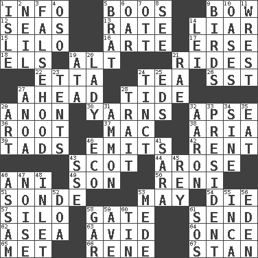 ACROSS 1. Information 5. Scornful sounds 9. Arrow shooter 12. Oceans 13. Pace 14. One who doesn't tell the truth 15. _ and Stitch 16. Johnson of "Laugh-In" 17. Celtic language 18. Raised railways 19. Keyboard modifier key 21. Amusement-park features 22. Singer James 24. Afternoon social gathering 26. Fast jet (abbr.) 27. Forward in time 28. Periodic rise and fall of the sea level 29. Soon (poet.) 30. Entertaining tales 32. Domed church section 36. Carrot, for example 37. Apple computer (short form) 38. Operatic vocal solo 39. Bits 40. Sends forth 42. Monthly bill 43. Native of Scotland 44. Came up 46. Cuckoo 49. Male offspring 50. Painter Guido (1575-1642) 51. Something which is sent 53. Fifth month 54. Expire 57. Grain storage tower 58. Yard entry 61. Post 62. At sea 63. Enthusiastic 64. Single time 65. Was introduced to 66. French philosopher Descartes 67. Comedian Laurel of Laurel & Hardy DOWN 1. Small island 2. Famous astronaut Armstrong 3. It jiggles the polygraph 4. Bear (Spanish) 5. Naughty child 6. Rowing implement 7. Baseball player Mel 8. Perceive with the eye 9. Avian creatures 10. Fertile tracts in a desert 11. Obtain by seizing forcibly or violently 14. Luau accessory 19. "One Day ___ Time" 20. Kenny Rogers chart-topper in '80 21. Actress Charlotte 23. Portable shelters 24. A color or tint 25. Begley and Asner 27. Small Philippine buffalo 28. Distinguishing feature 29. Nonscientific branch of learning 31. ID or VA city 32. Composer Copland 33. Elected leader of a country 34. Trig term 35. Ingest 40. Environmental prefix 41. "Two Mules for Sister ____" 43. Compass dir. 45. Marina Del _, California 46. Indian state 47. Annoying sound 48. An arm off of a larger body of water 52. ___ good deed 53. Ancient Persian 55. South American Indian 56. Genesis locale 58. Slender fish 59. "___ Maria" 60. Shallow baking pan 61. Distress signal