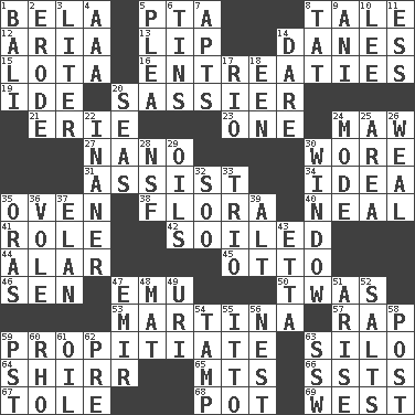 ACROSS 1. Actor Lugosi 5. Parent Teacher Assoc. 8. Lie 12. Operatic vocal solo 13. Mouth edge 14. Natives or inhabitants of Denmark 15. Globular water bottle used in Asia 16. Pleas 19. Binary compound 20. More impudent 21. One of the Great Lakes 23. Single 24. Informal term for the mouth 27. Billionth: prefix 30. Had on 31. Aid 34. It may be bright or harebrained 35. Baking chamber 38. Plants 40. Be tempered by heat 41. Hero or heavy, e.g. 42. Dirtied 44. Having or resembling wings 45. "Beetle Bailey" pooch 46. Elected rep. 47. Australian flightless bird 50. It was, poetically 53. Chrissie's court nemesis 57. Reproach for some lapse or misdeed 59. Appease 63. Grain storage tower 64. Bake eggs in their shells 65. Mountains (abbr.) 66. Fast planes 67. Lacquered or enameled metalware 68. Cooking vessel 69. 270 degrees DOWN 1. Indonesian resort city 2. Wear away 3. 61 cubic inches 4. American Automobile Association (abbr.) 5. Entreaty 6. Metal containers 7. Tenement units (abbr.) 8. Make lace 9. Cuckoo 10. Area sheltered from the wind 11. Double-curved letter 14. Have the gumption 17. _ de Janeiro 18. Car or cant ending 20. Oceans 22. More empty; more void 24. Method 25. Type of rug 26. Welt 28. Science/research agcy. 29. Lubricates 30. Light entry point 32. "Barney Miller" actor Jack 33. Musical group of three 35. Mouths or openings 36. Grand slam 37. Liveliness 39. The first octave above the treble staff 43. Singer James 47. Independent ruler or chieftain 48. Floor covering 49. RI univ. 51. Get up 52. Table seasonings 54. Pack (down) 55. "Tell ____ the Marines!" 56. Egg locale 58. Mail 59. Pacific Standard Time (abbr.) 60. 17th letter of the Greek alphabet 61. Petroleum 62. Before (prefix) 63. Compass dir.