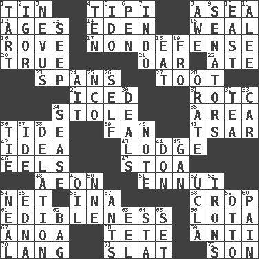 ACROSS 1. Shallow baking pan 4. Native american tent (variation) 8. At sea 12. Matures 14. Genesis locale 15. Welt 16. Be footloose 17. Unrelated to defense, as in spending 20. Loyal 21. Rowing implement 22. Had dinner 23. Connects, as a bridge 27. A blast of a horn 29. On the rocks 31. College mil. group 34. Fur scarf 35. Length times width 36. Periodic rise and fall of the sea level 39. Avid follower 41. Russian ruler of old 42. It may be bright or harebrained 43. Cabin 46. Snakelike fish 47. Portico 48. A really long time 51. World-weariness 54. Remaining after all deductions 56. _ tizzy (2 wds.) 58. Riding implement 61. The property of being fit to eat 66. Globular water bottle used in Asia 67. Small Philippine buffalo 68. False hair 69. Opposed to 70. Long (Scottish) 71. Narrow board 72. Manchild DOWN 1. Small pie 2. Russian composer Stravinsky 3. Mole, birthmark 4. "___ Little Indians" 5. Wedding promise 6. Fenced enclosure 7. Southeast Asian peninsula 8. Deep reverence 9. Legislators 10. Compass direction 11. Toward shelter 13. Ooze 18. Ingest 19. Back 24. Small island 25. Non-commissioned officer (abbr.) 26. Automatic 28. Declaim 30. Allots cards 32. Beverage made from leaves 33. Automobile 34. Gospel singer Marvin 36. Neckwear 37. Binary compound 38. Accusation by an informer 40. Musical sound 44. Spanish title 45. Separate the seeds from cotton 49. Lubricate 50. Compass dir. 52. Southern CA. univ. 53. Removes the wrinkles 54. Actress Patricia 55. Pulitzer Prize-winning author Ferber 57. Pismires 59. Von Bismarck 60. Ache 62. Paper or plastic container 63. Snakelike fish 64. R.R. building 65. Arrange properly for use