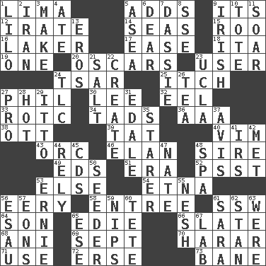ACROSS 1. Pale green bean 5. Does sums 9. ___ a Wonderful Life 12. Feeling or showing extreme anger 14. Oceans 15. Friend of Pooh 16. Member of a famous L.A. basketball team 17. Comfort 18. Call ___ day 19. Single 20. Motion picture awards 23. One who uses or employs something 24. Russian ruler of old 25. Hankering 27. Silvers or Donahue 30. Area sheltered from the wind 32. Snakelike fish 33. College mil. group 34. Small amounts or degrees 36. American Automobile Association (abbr.) 38. Baseball player Mel 39. Make lace 40. Zeal 43. The grampus (Milton) 46. Enthusiasm 48. Beget 49. Begley and Asner 51. Period 52. Inconspicuous attention getter 53. Otherwise 54. Inactive volcano in Sicily 56. Suggestive of the supernatural 58. Main course 61. Compass dir. 64. Boy, to dad 65. Singer Brickell 66. Chalkboard 68. Black tropical American cuckoo 69. Back-to-school mo. 70. Ethiopian city, capital of Harari 71. Purpose 72. Celtic language 73. Object of repulsion DOWN 1. _ and Stitch 2. SW Asia republic 3. Cause to be 4. Had dinner 5. Toward the sea 6. Letter starter 7. Small ungulate mammals of Africa 8. Compass dir. 9. From or relating to Ireland 10. Carryall 11. Fly high 13. Greek god of love 21. Table seasoning 22. Make 23. Southern CA. univ. 24. Affectionate concern, for short 26. Beverage made from leaves 27. Adept person 28. Being at a high temperature 29. "Tell ____ the Marines!" 31. Peak District village in England 35. A viewer who gazes fixedly 37. Deliberation 41. Big collection agency 42. Was introduced to 44. Trust 45. Music discs 47. Nathan's nickname 48. Health resort 50. Sowing specialist 53. Bert's buddy 55. Delicate 56. Son of Isaac 57. Immeasurably long periods of time 59. Cuts off 60. Wig 61. "Two Mules for Sister ____" 62. Comedian Laurel of Laurel & Hardy 63. We are 65. Compass dir. 67. Experiment locale