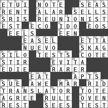 ACROSS 1. Needle holder 5. Short letter 9. Oceans 13. Monthly bill 14. Having or resembling wings 15. Exchanges for money 16. Indian titles of respect 17. One who advocates reunion 19. Eastern Standard Time (abbr.) 20. Environmental prefix 21. Wedding promise 22. Greek goddess of the dawn 23. Snakelike fish 25. Car or cant ending 26. Artist's stand 30. Singer James 34. New (sp.) 35. Heroin 36. Grain storage tower 39. Trials 42. ____ d'Azur (French Riviera) 43. Tumult 44. Webber/Rice musical 46. Singer Brickell 47. More valued for its uncommonness 48. Ingest 51. Tenement units (abbr.) 54. Institute legal proceedings 57. Deep reverence 58. Make imperfect 60. To free from 62. Interpreter 65. Haul 66. Match 67. General guideline 68. Baking chamber 69. Relief 70. Observes 71. Trial DOWN 1. Celtic language 2. Laconic 3. Join together 4. ___ a Wonderful Life 5. Drug cop 6. Butter sub 7. The 19th letter of the Greek alphabet 8. Bert's buddy 9. Elected rep. 10. Writer Wiesel 11. In addition 12. Fast planes 15. Within a short period 18. Binary compound 20. Son of Isaac 24. Poe poem 27. Arrange properly for use 28. Night before a holiday 29. Failure 30. Fortification 31. Ring climax 32. Make lace 33. Grow older 36. Compass dir. 37. It would 38. Cards in a Roman deck? 40. Federal power corp. 41. Title for a knight 45. Pull into pieces 48. Relaxation 49. Leather borer 50. Pulls into pieces 52. Collection of objects 53. Settings 54. Play the lead 55. Goad 56. Hearing organs 58. Undercover agent 59. Ancient Greek god of war 61. Gouge 63. Fish or hair follower 64. Third day of the wk. 65. Small child