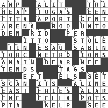 ACROSS 1. Electrical Unit 4. Came down and settled, as after flight 8. Three (prefix) 11. Pile 13. Ancient Roman robes 15. Car or cant ending 16. Singer James 17. To the left, to Queeg 18. Penny 19. Sports stadium 21. Friend of Pooh 22. To (old English) 23. Lair 24. To free from 27. For each 29. "Tell ____ the Marines!" 30. Took without asking 34. Metal container 36. Son of Isaac 39. Unit of acoustic absorption 40. Torque (variant) 41. Paris' subway 43. Charged atoms 44. With great haste 46. Letter starter 47. Born 48. Is inclined (to) 49. Labels 51. Newt 53. Raised railways 54. Put into a specified state 57. Glance over 60. It is 63. Place in a line 65. 90 degrees 66. Strips of potato fried in deep fat 69. Having or resembling wings 70. Compass dir. 71. Chap (slang) 72. Cooking vessels 73. Parent Teacher Association (abbr.) 74. Seaweed 75. Observe DOWN 1. At or in the front 2. Distance measurement (Brit.) 3. Eucharist need 4. _ moment's notice (2 wds.) 5. Chop off 6. Russian composer Stravinsky 7. Edible starchy tuberous root 8. Adolescent 9. Monthly bill 10. To the inside or interior of 12. Baking dish 14. Close up, plug up 18. Window treatments 20. Nonscientific branch of learning 25. A distinct part 26. Administered medicine 28. Double-curved letter 29. Event 31. Mitch Miller's instrument 32. Actor's bit 33. Followers of ems 34. Heavy book 35. SW Asia republic 37. Had dinner 38. A salt of uric acid 40. Make lace 42. Relating to the mouth 45. Overdraft (abbr.) 50. Girls' org. (abbr.) 52. Small quarrel 54. Grain storage towers 55. Related on the mother's side 56. Laconic 57. Ooze 58. Patter 59. Toward the sea 61. Long journey 62. Drop; flow; fall 64. Infant locale 67. Pipe bend 68. Plant excrement