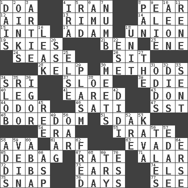 ACROSS 1. ___ good deed 4. SW Asia republic 8. Lightbulb-shaped fruit 12. Wind 13. Tall New Zealand timber tree 14. Toward shelter 15. International (abbr.) 17. First of billions? 18. The state of being joined or united 19. Atmospheres 21. Benjamin's nick name 23. Compass dir. 24. Gospel singer Marvin 26. Be seated 28. Seaweed 30. Modes 34. _ Lanka 37. _ gin 39. Singer Brickell 40. Part of a journey 41. Having ears or earlike features 43. Spanish title 44. Aroma 46. Suttee (variant) 47. Fast jet (abbr.) 48. Mood resulting from idleness 51. Neighbor of Neb. 54. Epoch 55. Feeling or showing extreme anger 58. Actress Gardner 61. Sandy's bark 63. Elude 65. Debunk (Brit. slang) 67. Assign a rank or rating to 71. Having or resembling wings 72. Claim 73. Hearing organs 74. Raised railways 75. Fastener 76. 24-hour periods 77. Perceive with the eye DOWN 1. Raised platform 2. Pig sounds 3. Nick name for Arthur 4. Retirement account (abbr.) 5. To free from 6. Housemaid (var.) 7. Unfeeling 8. Baking dish 9. Writer Wiesel 10. Period of immesurable duration 11. French philosopher Descartes 16. Path through which fluid escapes 18. A single undivided whole 20. Compass dir. 22. Compass dir. 25. Otherwise 27. Definite Article 29. Suffix with ecto or cyto 30. Confronts 31. Probability 32. "Vaya con ____" 33. Posted 34. Oscar Madison type 35. Do over again 36. Russian composer Stravinsky 38. Mouth or opening 42. "You Light Up My Life" star Conn 45. Portuguese money of account (variant) 49. To trail on the ground 50. Boat paddle 52. "We ___ not amused" (Victoria) 53. Polynesian shrub of the pepper family 56. Stories 57. Peak District village in England 58. Sums up 59. Distinctive style or manner 60. Swedish rock group 62. Flintstone 64. Celtic language 66. Viper 68. American Automobile Association (abbr.) 69. Attempt to accomplish something 70. Curvy letter