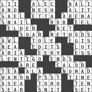 ACROSS 1. Cards in a Roman deck? 4. Actor Baldwin 8. Indonesian resort city 12. Plus 13. Soft 14. Came down and settled, as after flight 15. Highlander 17. Singer James 18. Sports stadium 19. Slow-paced one 21. Director Reiner 23. Snakelike fish 24. A person who is older than you are 26. Fish or hair follower 28. Fly high 30. Modes 34. Leather borer 37. Lacquered or enameled metalware 39. Armor plate that protects the chest 40. Teachers' org. 41. Proofreads 43. Car dealer's back yard 44. Roberta Peters solo 46. Suggestive of the supernatural 47. Curvy letter 48. Small, flat, pigmented spot on the skin 51. Extremities 54. "We ___ not amused" (Victoria) 55. Bodily heat indicating an inflammation 58. Afternoon social gathering 61. Insect wing 63. Roamer 65. Make _____ (do battle with) 67. Inconspicuous attention getter 71. Prong on a fork 72. At sea 73. "Corrida" creature 74. "___ Little Indians" 75. Wither 76. In a ____ (agitated or irritated) 77. Put into a specified state DOWN 1. Straggles 2. Silly 3. Standard of perfection 4. One (Scot) 5. Allow 6. Eastern Standard Time (abbr.) 7. Burn to charcoal 8. Tavern 9. Toward shelter 10. Actor's bit 11. Slanted text style (abbr.) 16. Flaplike coverings 18. Collude with 20. Lion 22. Single 25. Pace 27. Definite Article 29. Cowboy competition 30. Distance measurement (Brit.) 31. Stare at amorously 32. "Vaya con ____" 33. Fast planes 34. Of or related to the anus 35. Past tense of be (plural) 36. (Had) reclined 38. Falsehood 42. Synchronize (abbr.) 45. _ moment's notice (2 wds.) 49. SW Asia republic 50. Set 52. One of the 12 tribes of Israel 53. Narrow opening 56. Leaves out 57. Indian princess (variant) 58. It was, poetically 59. Relaxation 60. Type of rug 62. Tenement units (abbr.) 64. Undesirable depression on a surface 66. Boat paddle 68. Male child 69. _ Lanka 70. Small child