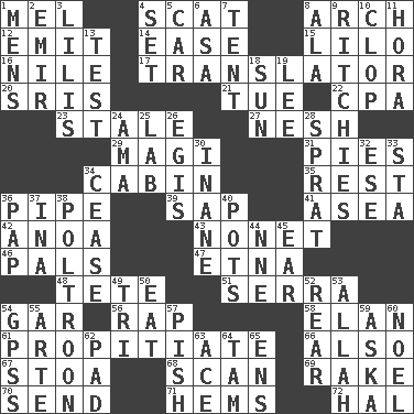 ACROSS 1. Cartoonist voice _ Blanc 4. Scram! 8. Bowlike part 12. Give off 14. Relaxation 15. _ and Stitch 16. The longest river in the world 17. Interpreter 20. Indian titles of respect 21. Third day of the wk. 22. Numbers guy (abbr.) 23. Lacking originality or spontaneity 27. Soft 29. Wise men 31. Sliced desserts 34. Apartment or room in a ship 35. Take ten 36. Corncob 39. Plant excrement 41. Toward the sea 42. Small Philippine buffalo 43. Music written for nine 46. Friends 47. Inactive volcano in Sicily 48. Wig 51. Father Junipero _ 54. Slender fish 56. Strike 58. Flair 61. Conciliate 66. In addition 67. Portico 68. Skim 69. Libertine 70. Post 71. Cloth borders 72. Actor Linden DOWN 1. Not women's 2. Independent ruler or chieftain 3. Ms. Damita and namesakes 4. Arrange properly for use 5. Auto 6. White ___ sheet 7. Portable shelter 8. Insect wing 9. Actors Guy, Robert Welles, and Clint 10. Hoof sound 11. Israeli folk dance 13. Trial 18. Player for Phoenix 19. Area sheltered from the wind 24. Nursemaid (var.) 25. Experiment locale 26. Armor plate that protects the chest 28. Small fatty European fish 30. Empty; void 32. Compass dir. 33. R.R. building 34. Desist 36. Infant food 37. _ tizzy (2 wds.) 38. Characterized by complete cowardliness 40. Cooking vessels 44. Compass dir. 45. Ewer handle 49. Three (prefix) 50. Consume 52. Bring up, as a child 53. Assad's deity 54. Global Positioning Systems (abbr.) 55. Johnson of "Laugh-In" 57. Expression of disdain 59. "____ silly question..." 60. Christmas carol 62. Writing tablet 63. Adept person 64. Scottish cap 65. Followers of ems