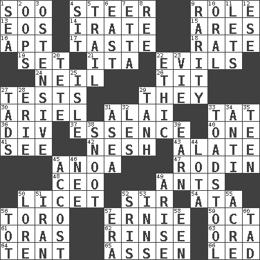 ACROSS 1. "Barney Miller" actor Jack 4. Bull 9. Hero or heavy, e.g. 13. Greek goddess of the dawn 14. Feeling or showing extreme anger 15. Ancient Greek god of war 16. Fitting 17. Clothes sense 18. Pace 19. Put into a specified state 21. Call ___ day 22. Vices 24. Famous astronaut Armstrong 26. Teat (slang) 27. Trials 29. Those things 30. Satellite of Uranus 31. Mountain range southwest of Kyrgyzstan 33. Make lace 36. HTML Container Element 37. Center 40. Single 41. Observe 42. Soft 43. Having winglike extensions 45. Small Philippine buffalo 47. "The Thinker" sculptor 48. Corporate head (abbr.) 49. Pismires 50. It is permitted: Lat. 52. Title for a knight 54. "One Day ___ Time" 56. "Corrida" creature 57. Bert's buddy 59. Sep. follower 61. Mouths or openings 62. Remove soap 63. Mouth or opening 64. Portable shelter 65. NE Netherlands city 66. Directed DOWN 1. Ocean 2. I made a mistake 3. Clearly or manifestly demonstrative 4. Be seated 5. Lag or linger behind 6. 90 degrees 7. Singer James 8. To riddle 9. Noteworthy scarcity 10. Of the mouth 11. Allows 12. Compass dir. 20. Wig 22. Principle of right and wrong 23. Compete 25. Capri or Wight 27. Small amounts or degrees 28. One of the Great Lakes 29. Hyperbolic tangent 31. Toward the sea 32. French article 33. Inedible or poisonous agaric 34. Opposed to 35. Adolescent 38. Snob 39. Merit 44. Globular water bottle used in Asia 45. Buttonhole 46. Born 49. Ascend 50. Old wives' tales, e.g. 51. SW Asia republic 52. Indian titles of respect 53. Lodging establishments 55. Land measure 56. Small child 57. Period 58. Car or cant ending 60. Small amount or degree