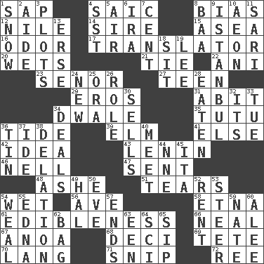 ACROSS 1. Plant excrement 4. Ketch in the Levant 8. Prejudice 12. "Death on the ____" 14. Father 15. Toward the sea 16. Aroma 17. Interpreter 20. Moistens 21. Neckwear 22. Black tropical American cuckoo 23. Sir (Sp.) 27. Adolescent 29. Greek god of love 31. "This won't hurt ____!" 34. A sleeping potion; an opiate (poet.) 35. Ballerina skirt 36. Event that recurs at intervals 39. Shade tree 41. Otherwise 42. The content of cognition 43. Soviet premier 1918-24 46. 1994 drama film starring Jodie Foster 47. Emitted 48. American tennis player Robert 51. Lacerates 54. Dripping 56. "___ Maria" 58. Inactive volcano in Sicily 61. The property of being fit to eat 66. Actress Patricia 67. Small Philippine buffalo 68. Tenth: prefix 69. False hair 70. Long (Scottish) 71. Sever or remove by pinching or nipping 72. To riddle DOWN 1. Overwhelm 2. Assistant 3. Ground plans 4. Fast jet (abbr.) 5. Wind 6. Lyricist Gershwin 7. Penny 8. Sound made by sheep 9. Byzantium, centuries later 10. A really long time 11. Indian skirt 13. Celtic language 18. Be seated 19. Area sheltered from the wind 24. ___ Haven, CT 25. Mouth or opening 26. Hero or heavy, e.g. 28. Eroded 30. Exchanges for money 32. It is 33. Third day of the wk. 34. Allots cards 36. Metal container 37. Binary compound 38. Accusation by an informer 40. Rendezvous 44. Compass dir. 45. Call ___ day 49. Actor Linden 50. First lady 52. Monthly bill 53. Navigate 54. Welt 55. Pulitzer Prize-winning author Ferber 57. Conclusions 59. Nathan's nickname 60. Toward shelter 62. Paper or plastic container 63. Car or cant ending 64. _-fi 65. Small drink